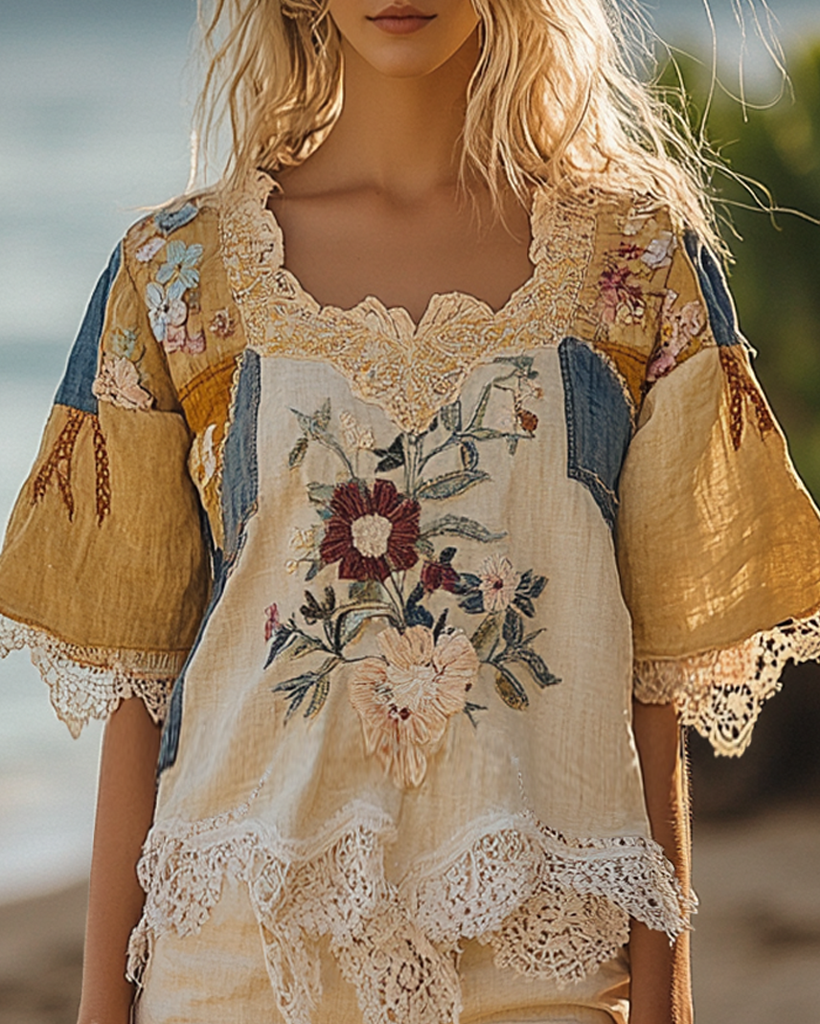 Women's Pink Rose Embroidery Art Round Neck Long Sleeve Linen Blend T-shirt a197$5.90 USD$104.00 USDDescribe your product