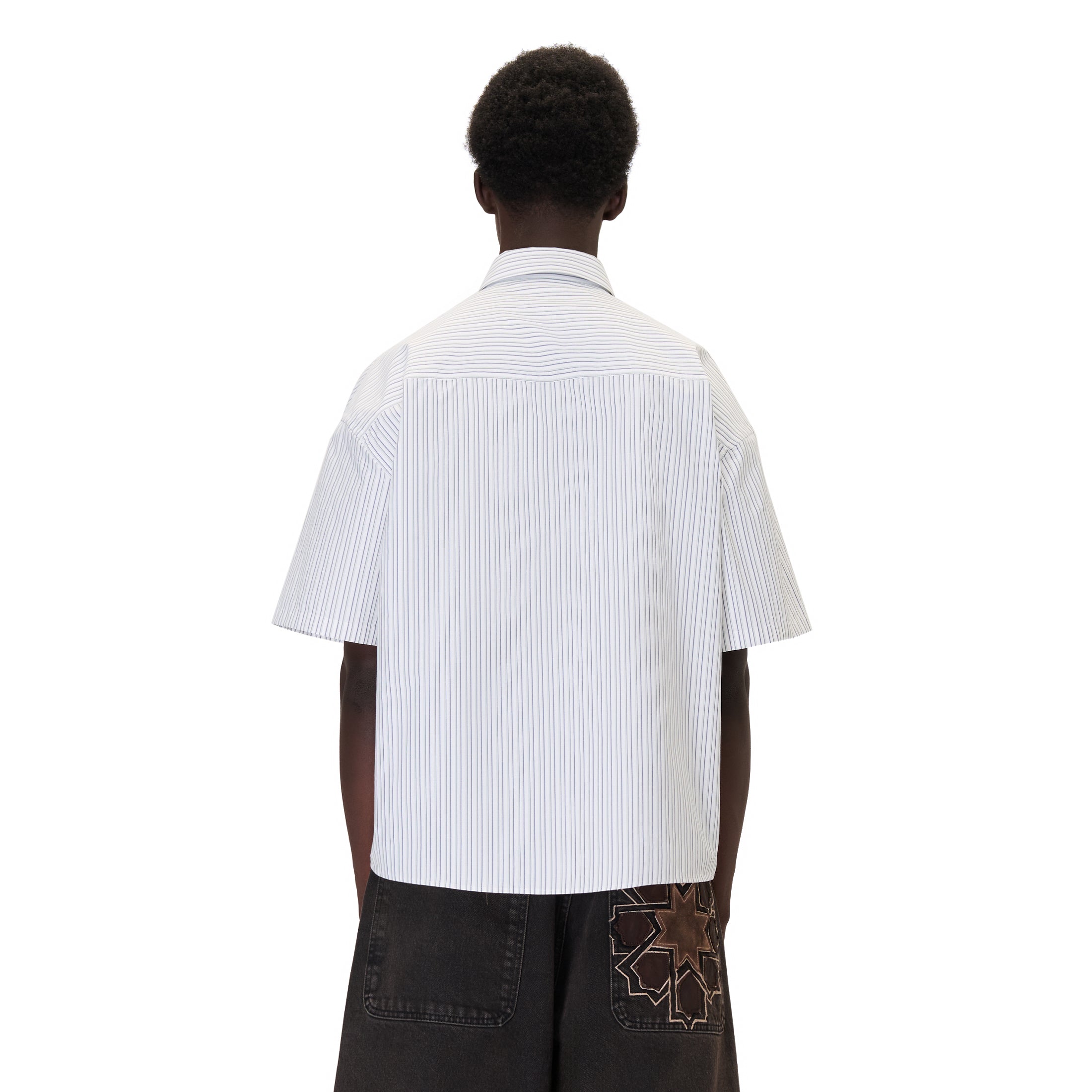 popline fabric / 57% cotton 43% polyester / embroidery on front / custom buttons / curved hem / relaxed fit / fits true to size