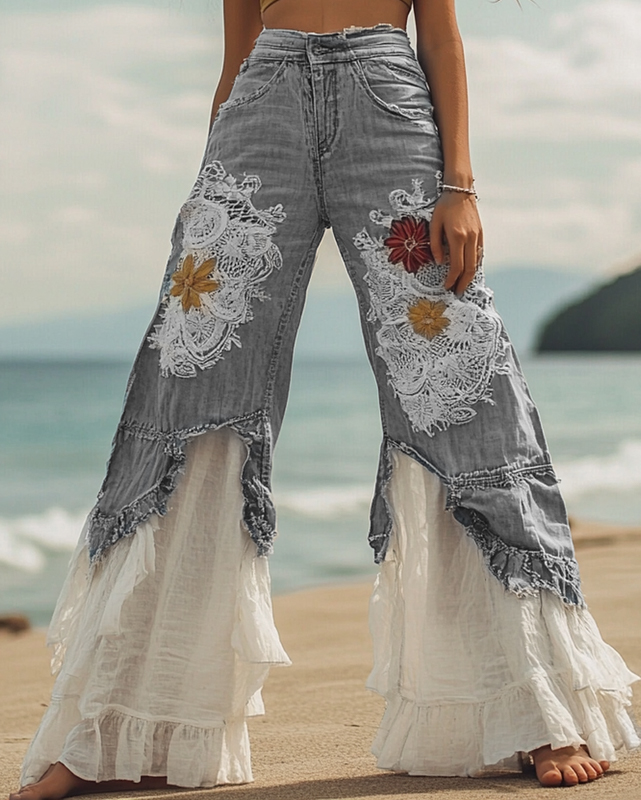 Summer Vacation Lace Handmade Floral Embroidery Pants 4096