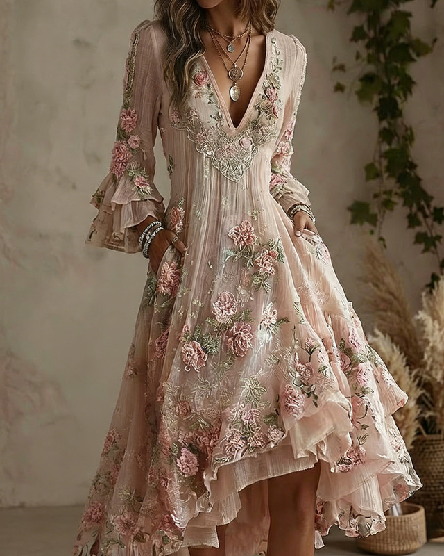 Women's Vintage Elegant Floral Embroidered Asymmetric Linen Blend Dress 9159