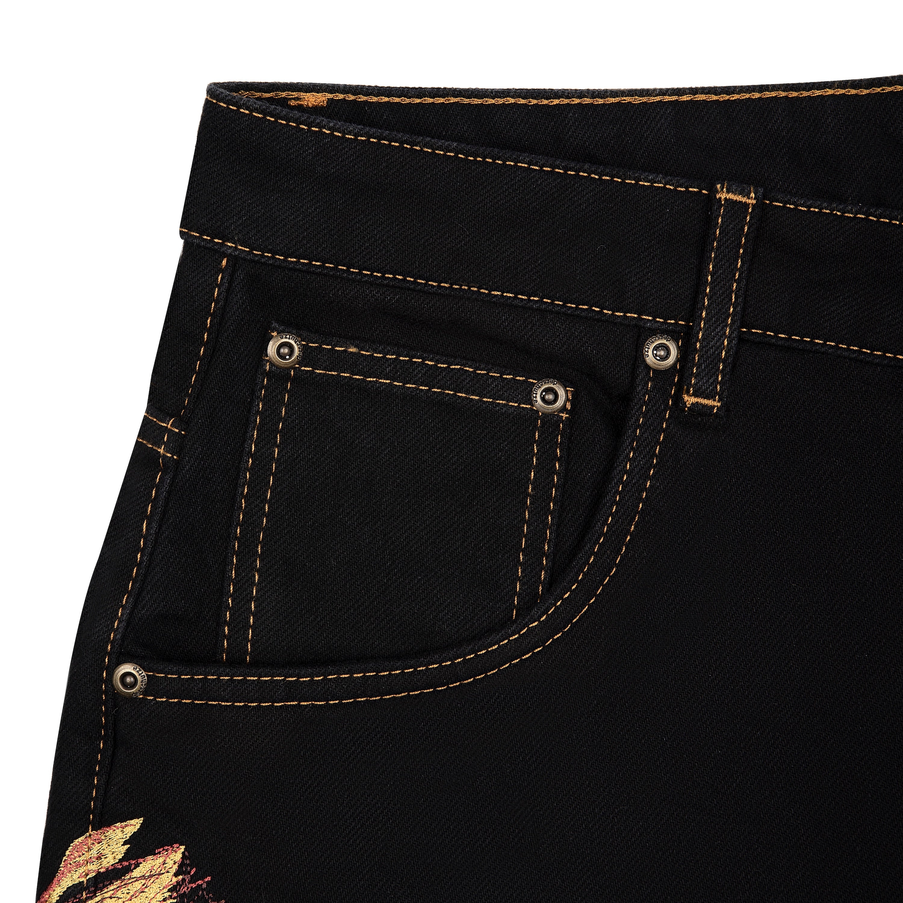14,5oz denim / 100% cotton / embroidery on front and back / embroidered leather patch / custom button / baggy fit / fits true to size