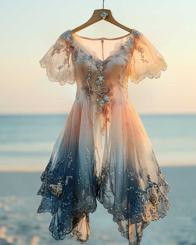 Summer Vacation Bohemian Hand Embroidered Lace Chiffon Dress 69b4