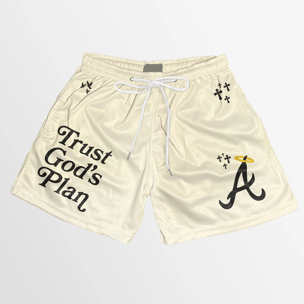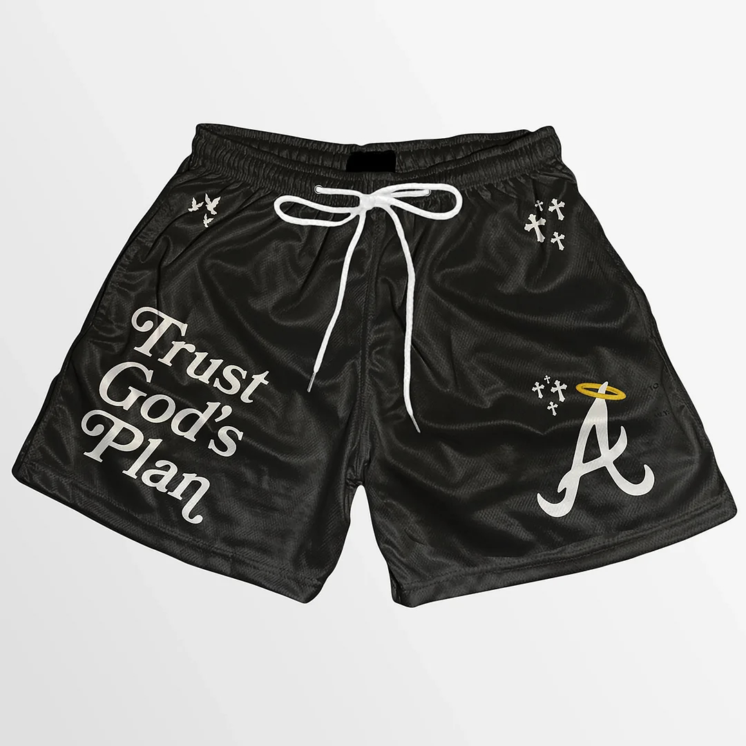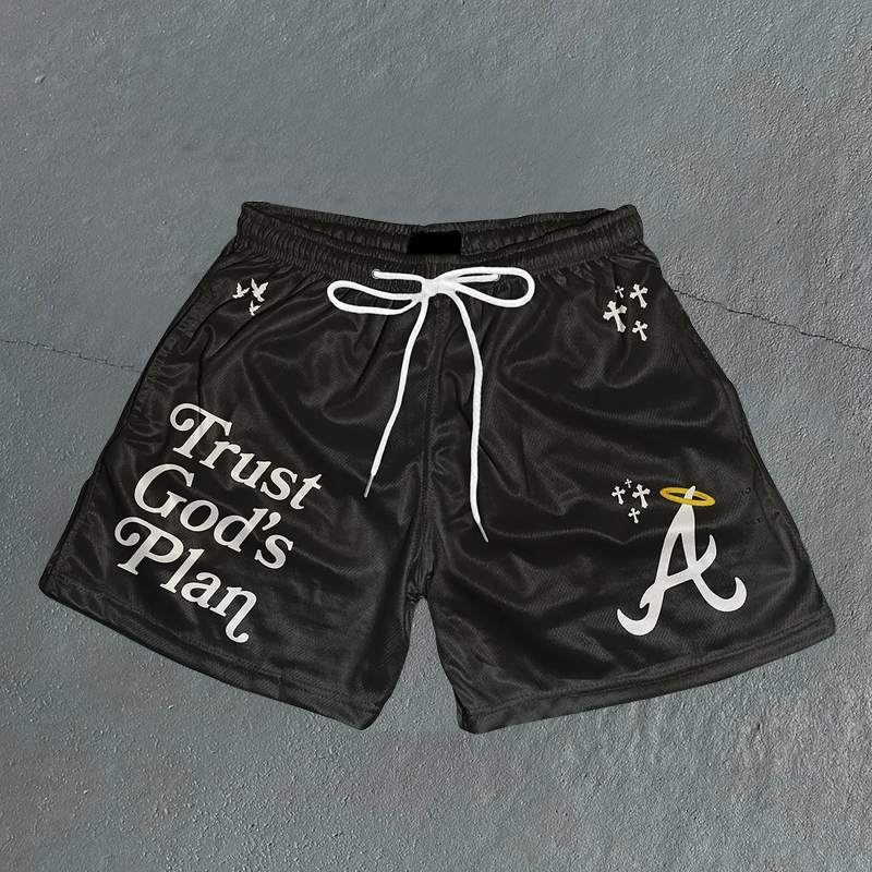 Trust God's Plan graphic-print mesh shorts