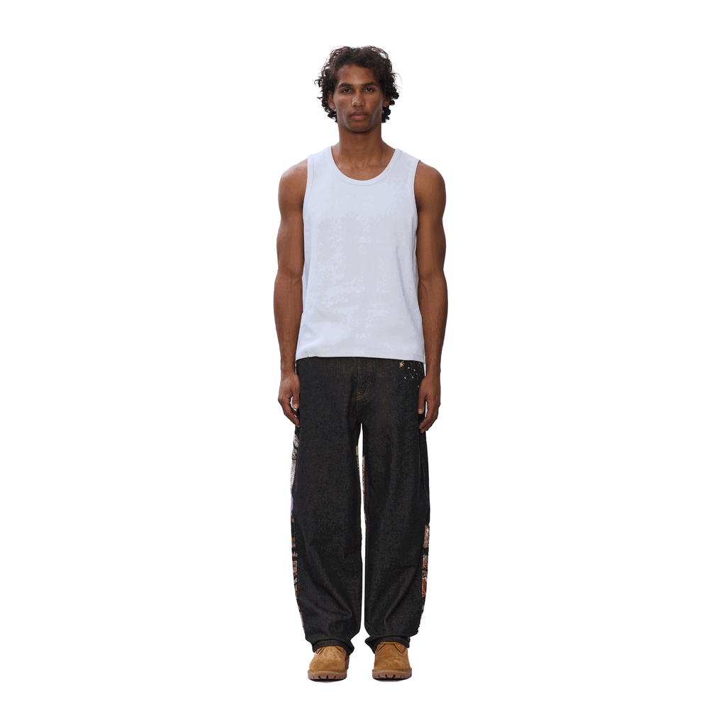 14,5oz denim / 100% cotton / embroidery on front and back / embroidered leather patch / wash inside out / straight fit / fits true to size