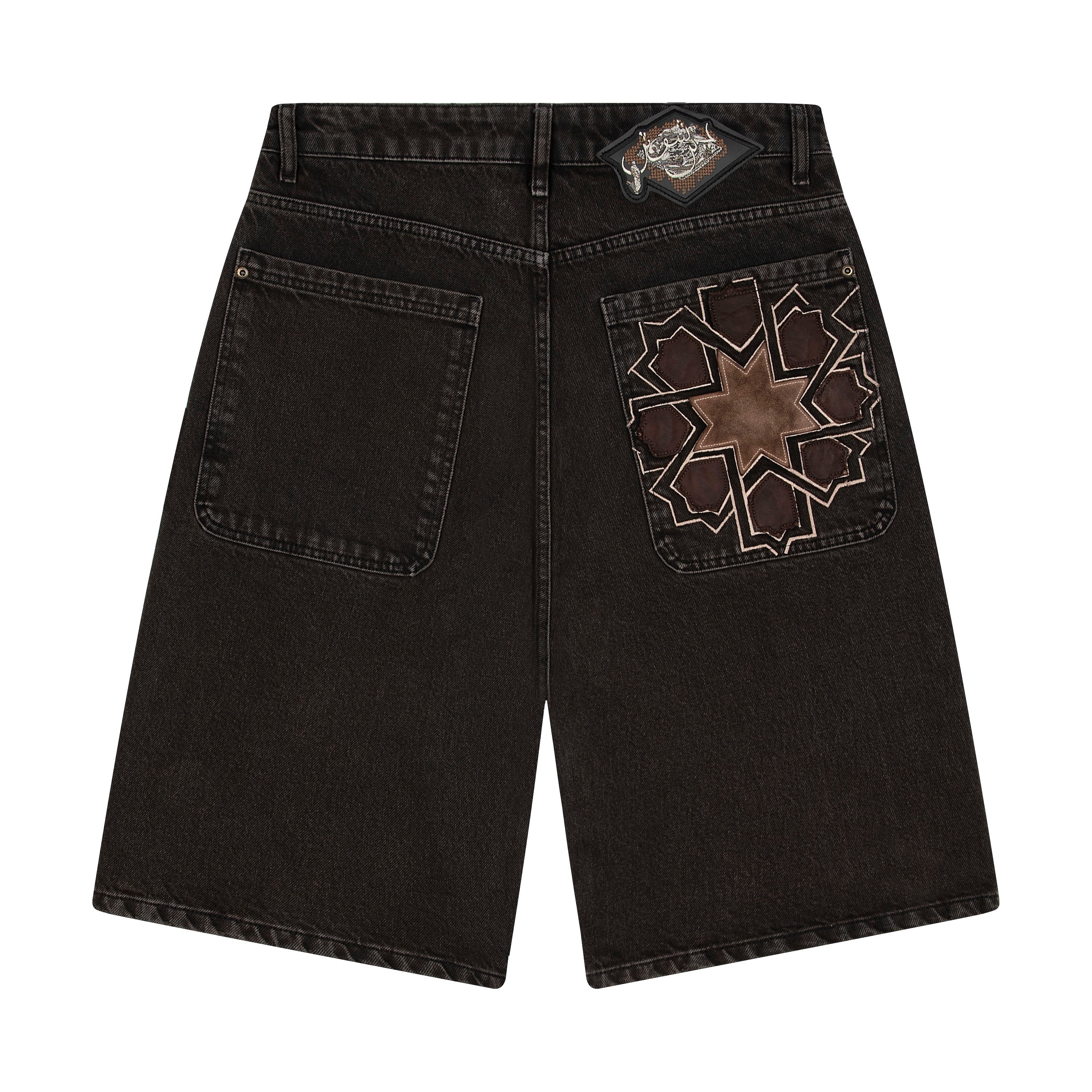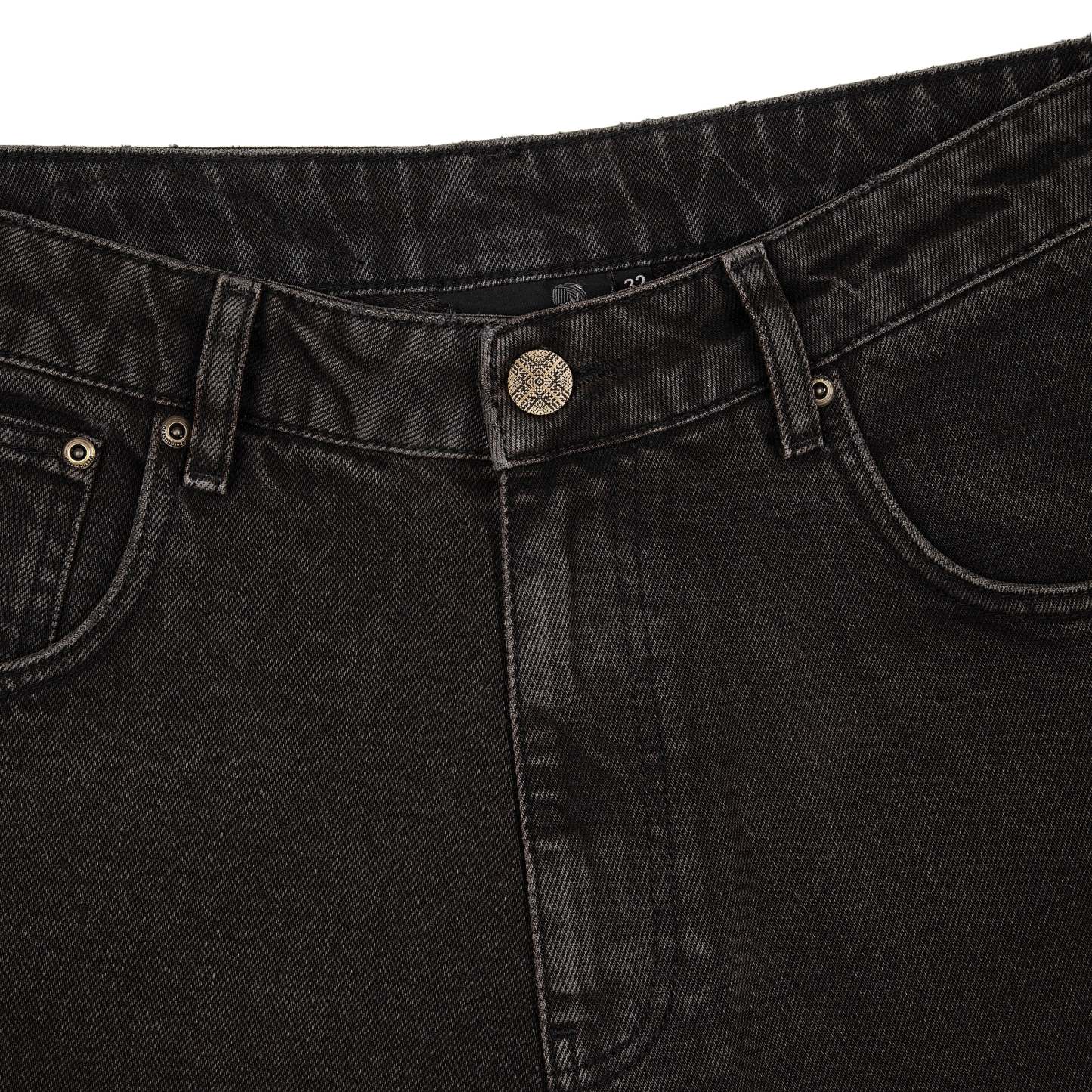 14,5oz denim / 100% cotton / genuine leather applique embroidery on back pocket / embroidered leather patch / custom button / brown washed effect / wash inside out / fits true to size