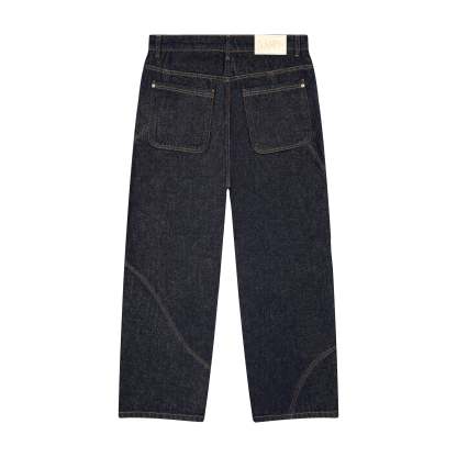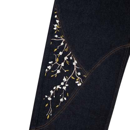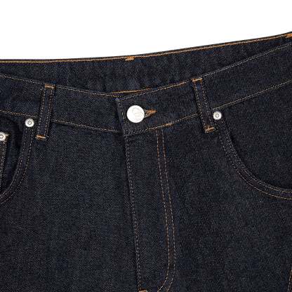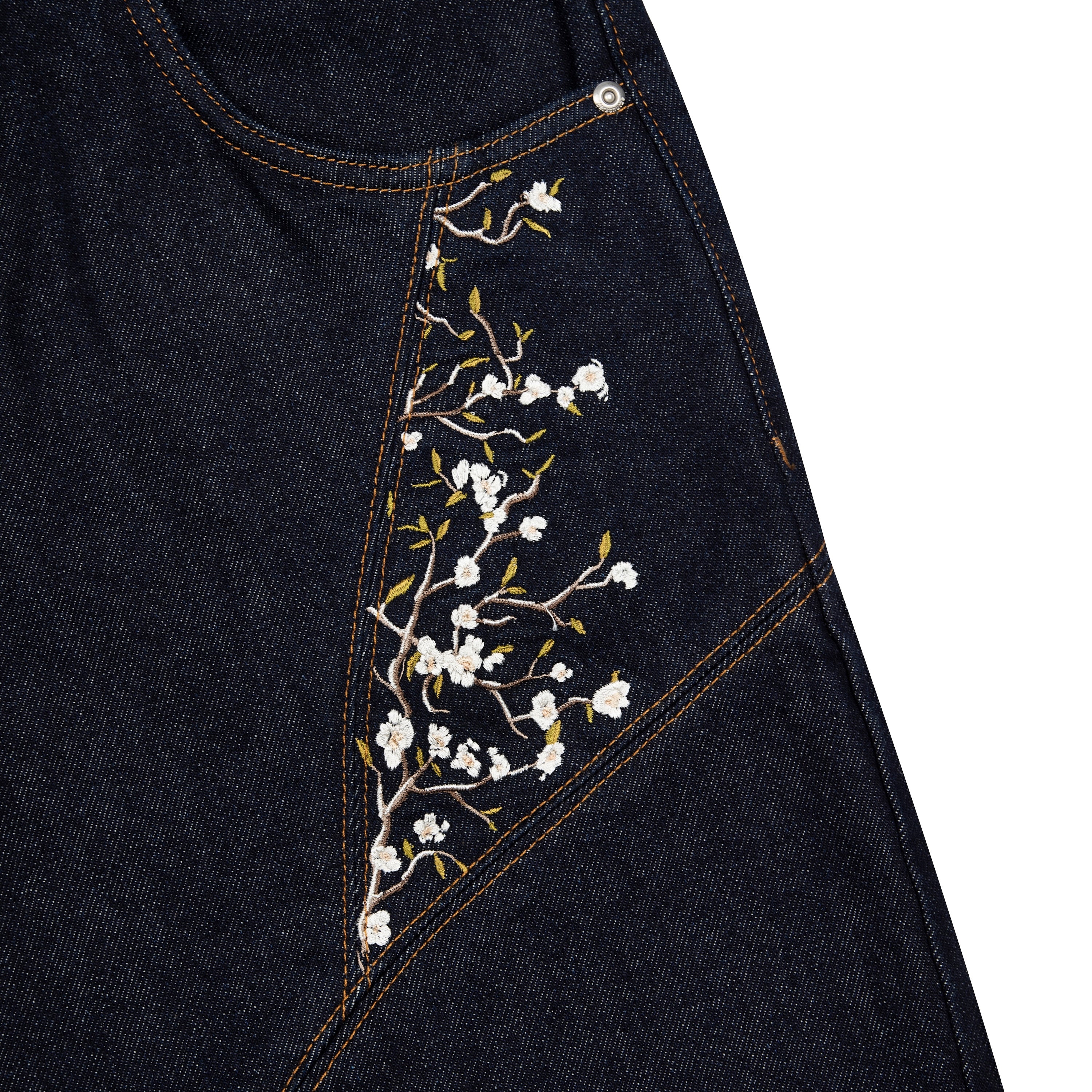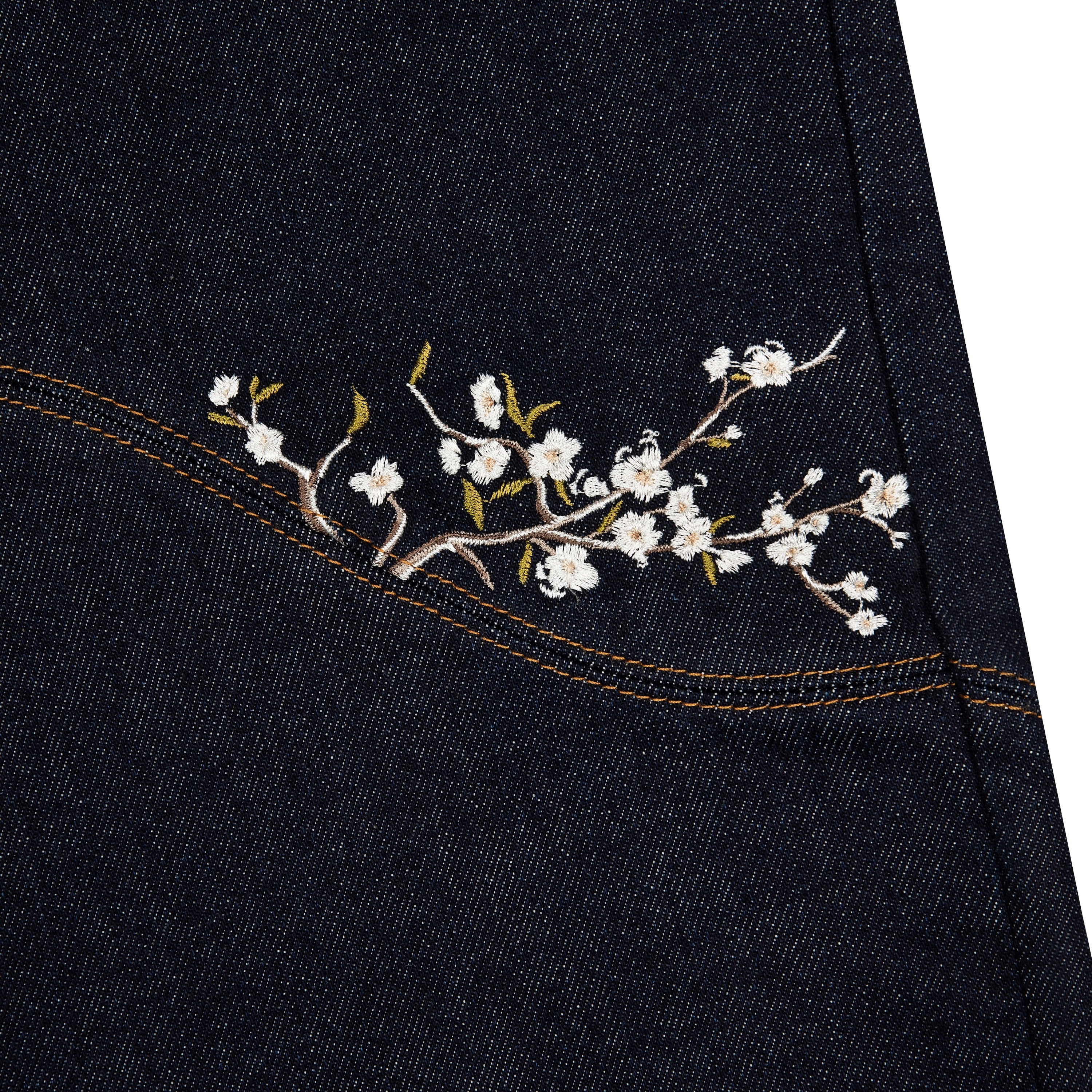 14,5oz raw denim / 100% cotton / made of different pieces / embroideries on front / embroidered leather patch / fabric may bleed or fade, wash inside out in cold water to preserve color and character / fits true to size