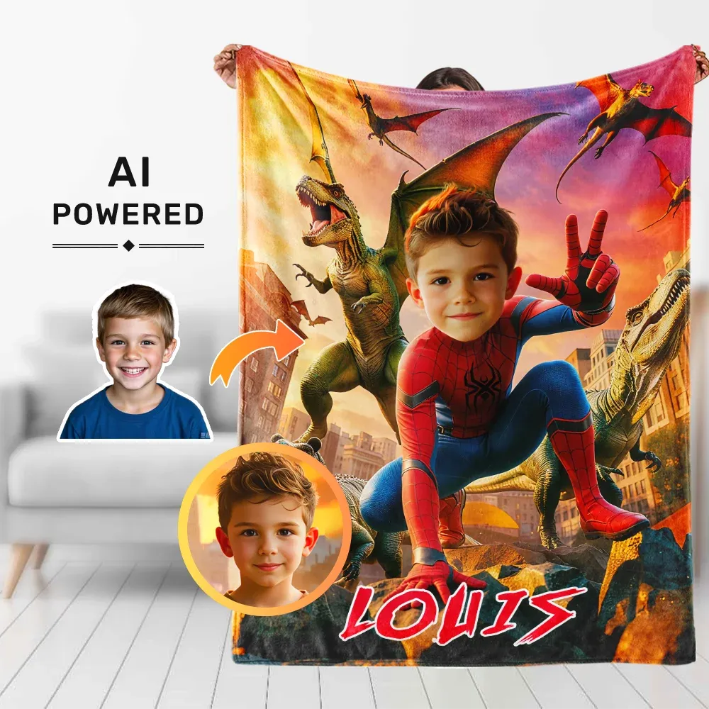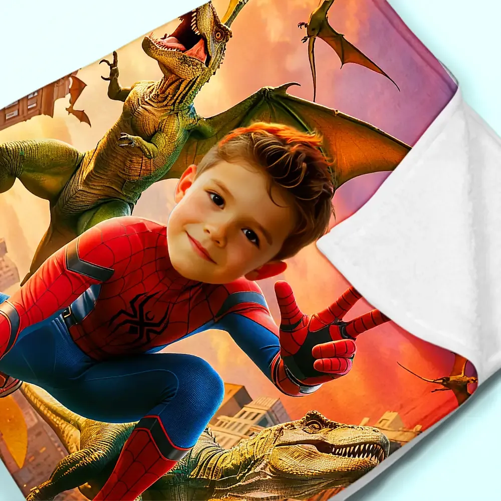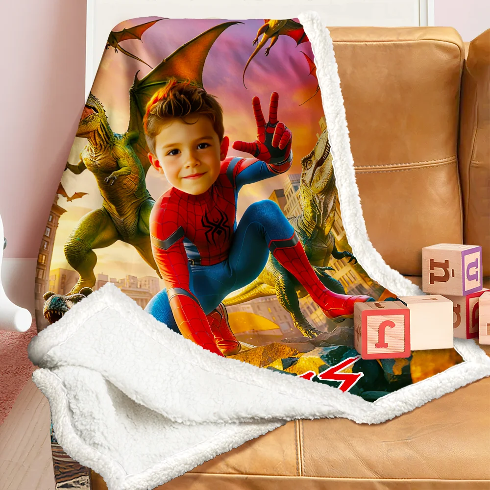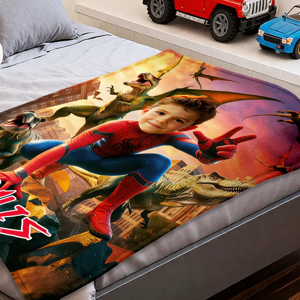 Custom Blanket AI Powered Orange & Purple Background Superboy and Flying Dinosaur City Adventure Children’s Day Gift for Boy