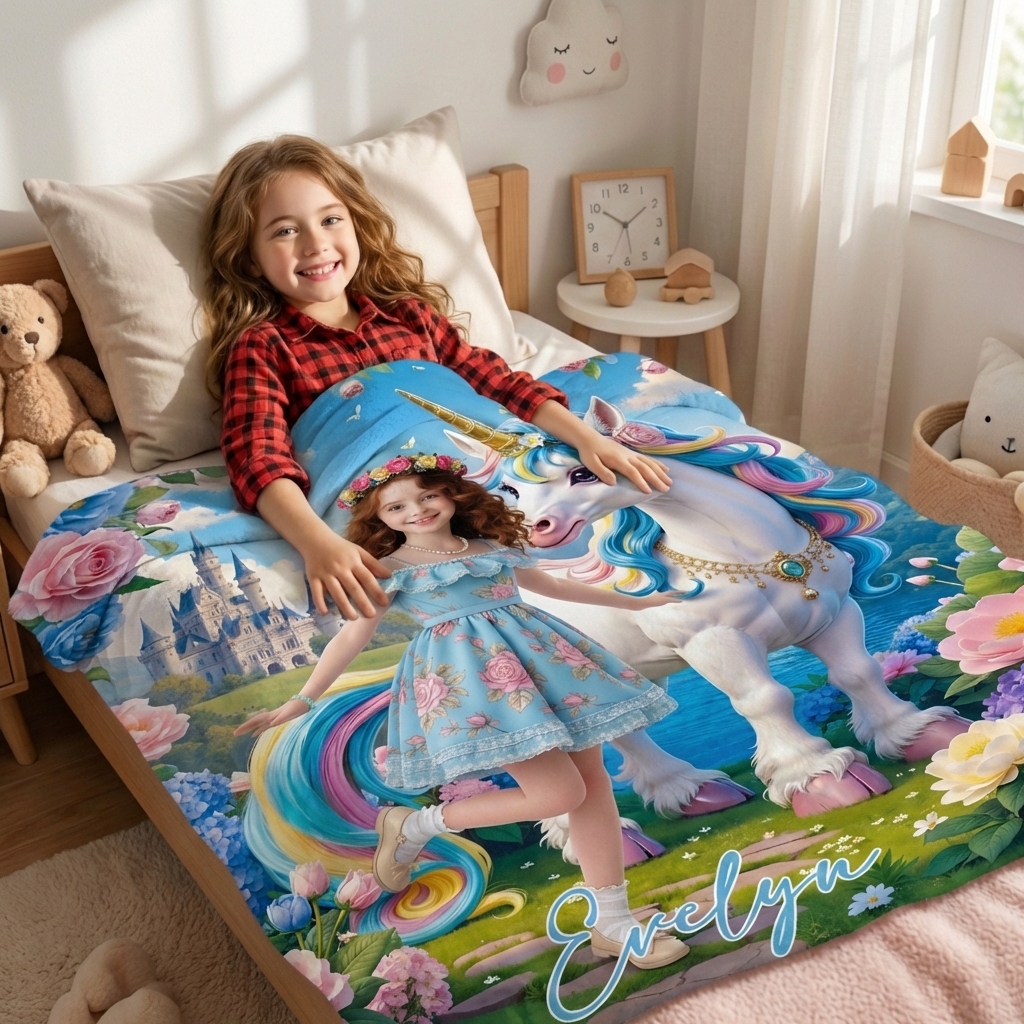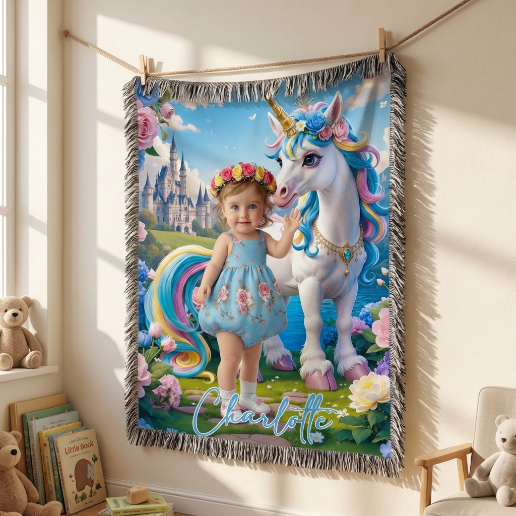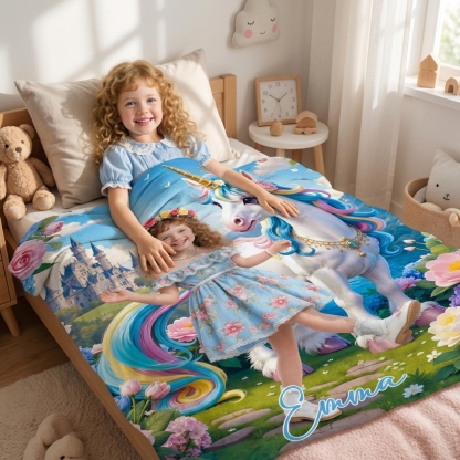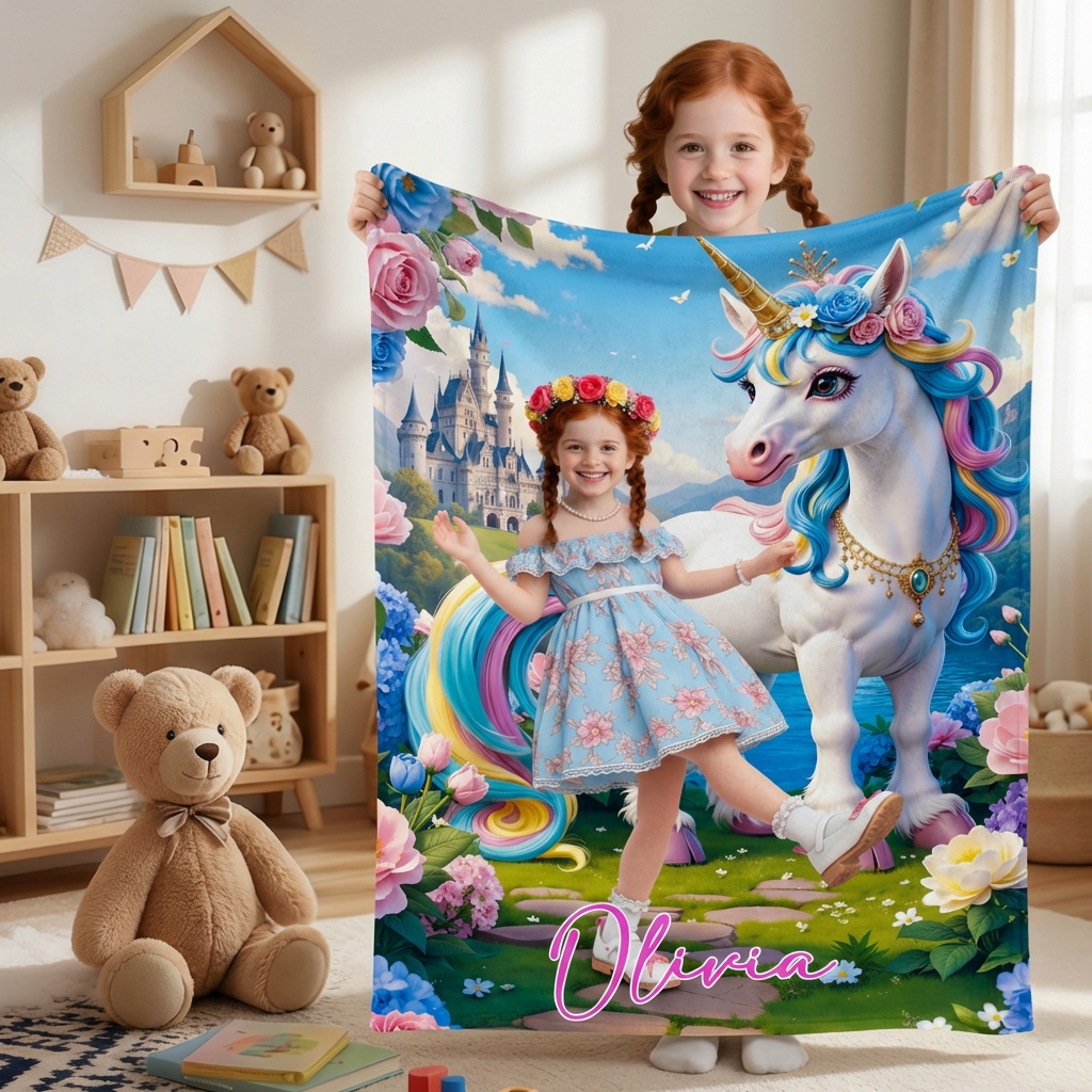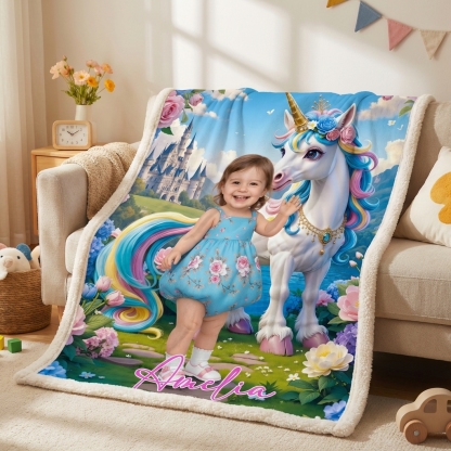 Custom Blanket AI Powered Princess with Rainbow Mane Unicorn in Fantasy Garden Gift for Girl