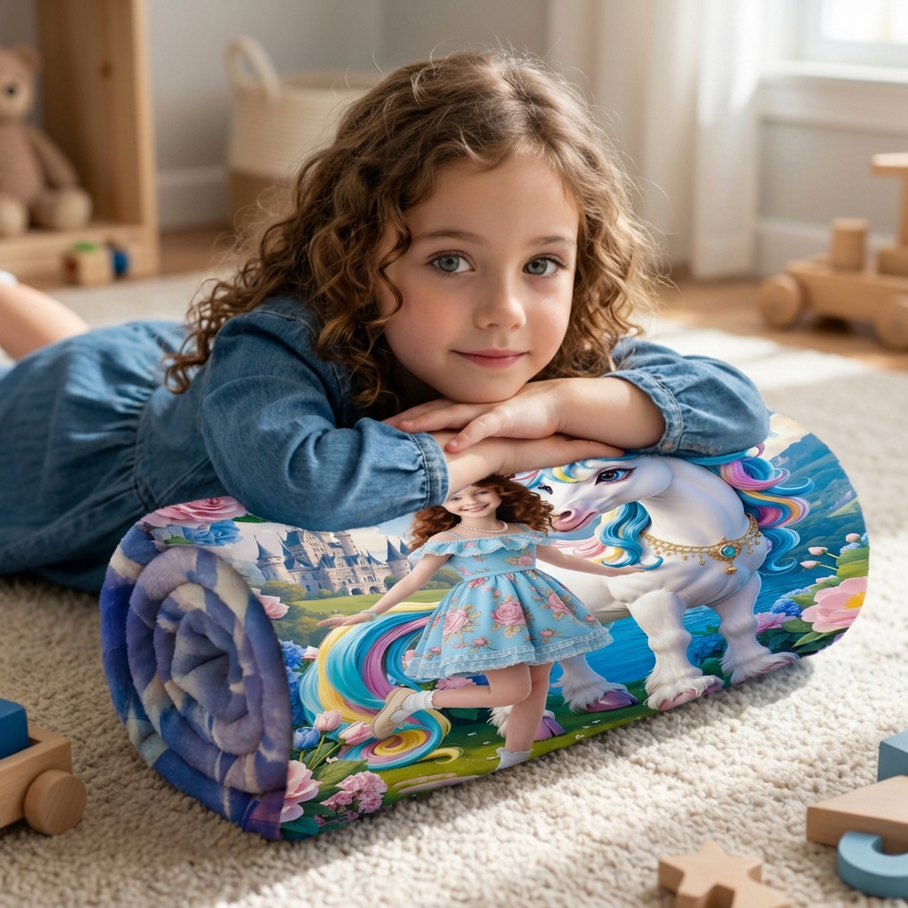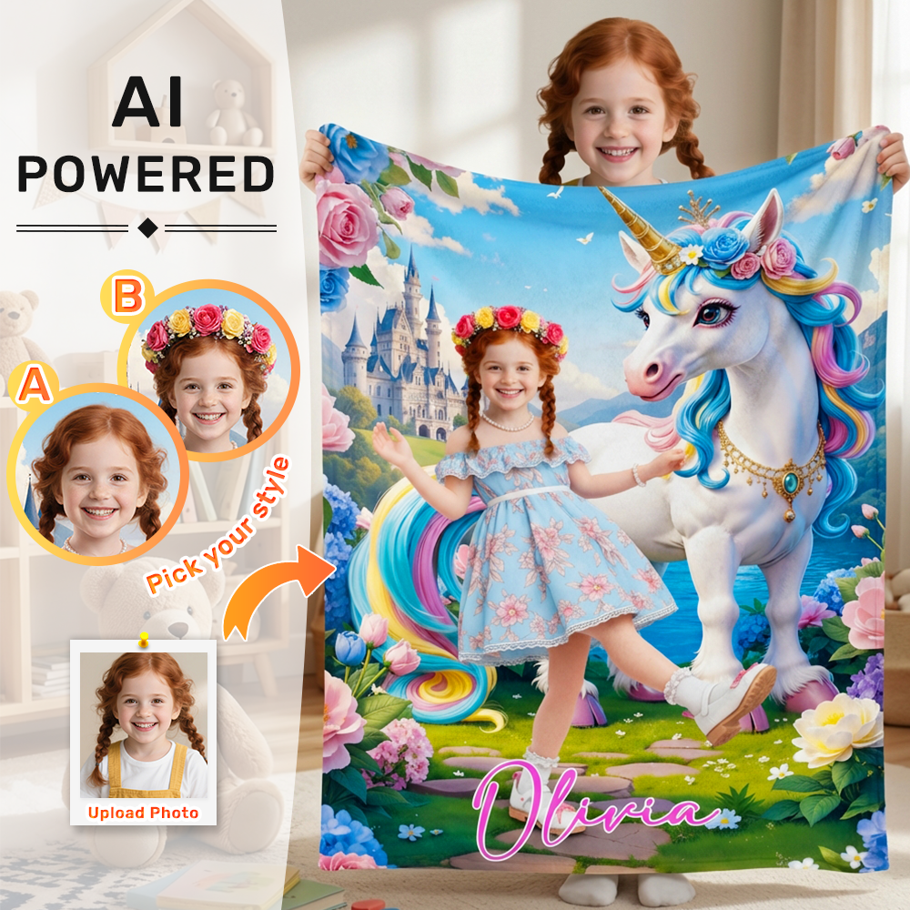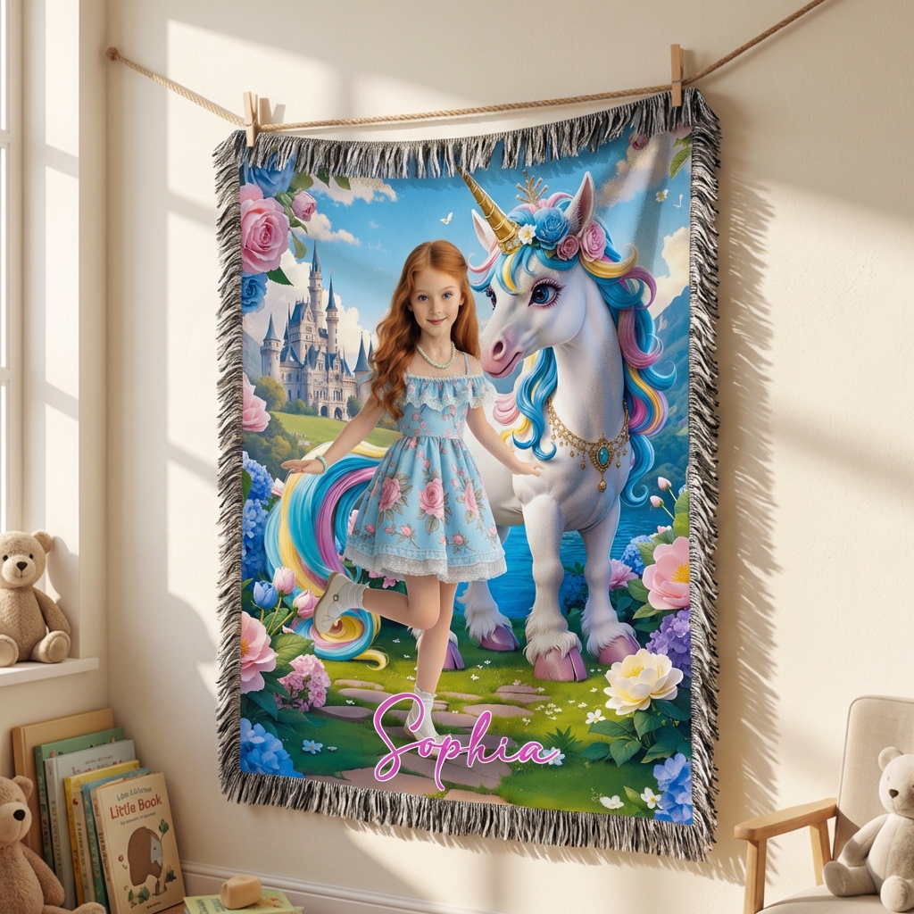 Custom Blanket AI Powered Princess with Rainbow Mane Unicorn in Fantasy Garden Gift for Girl