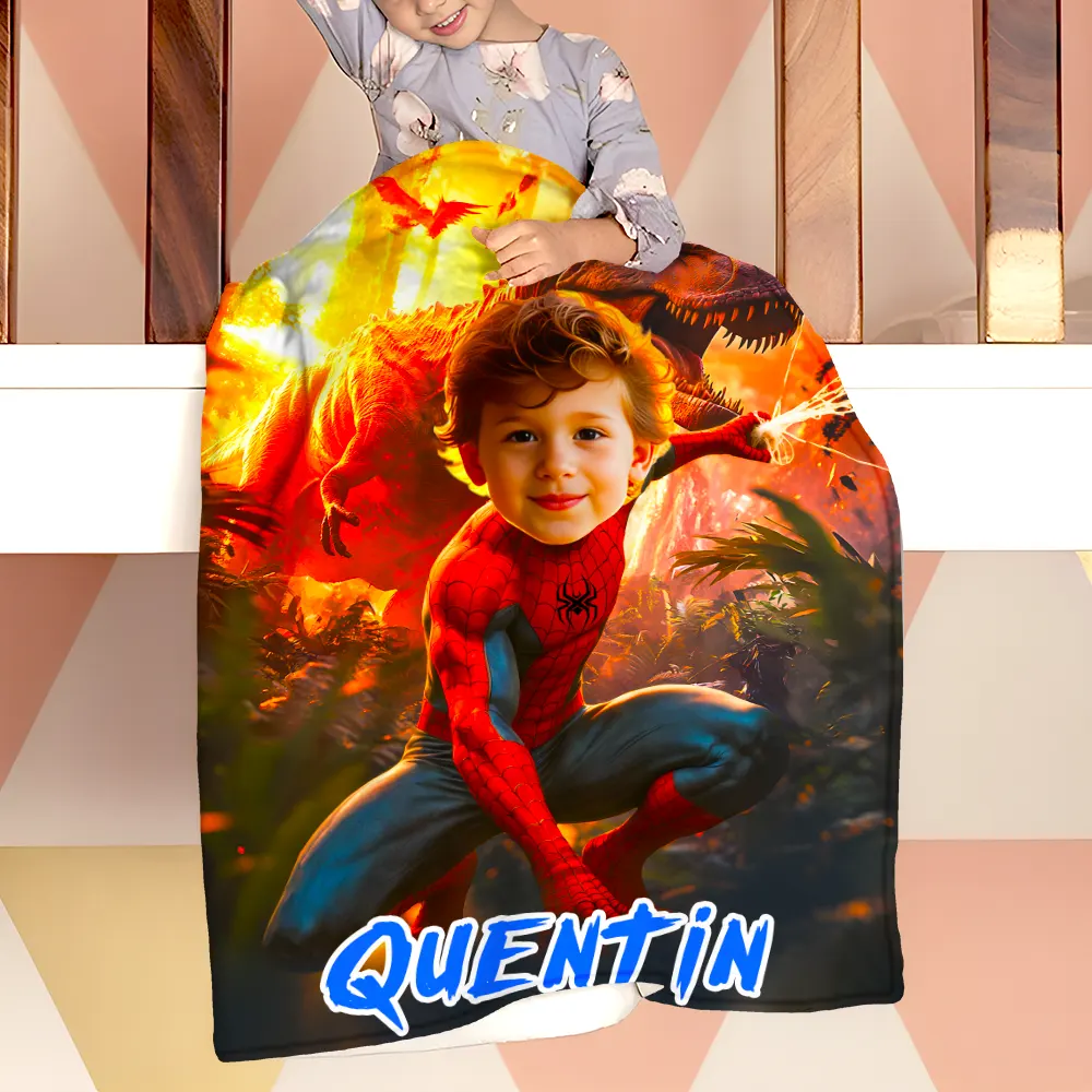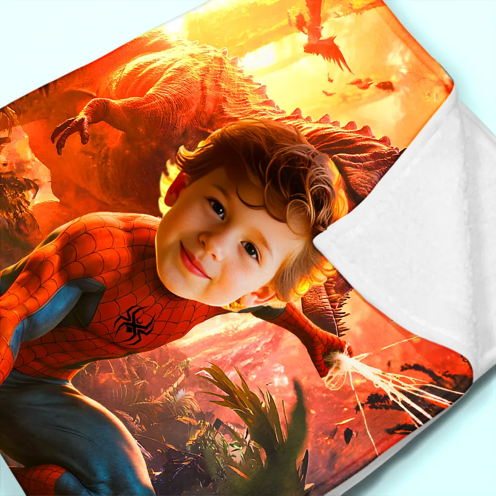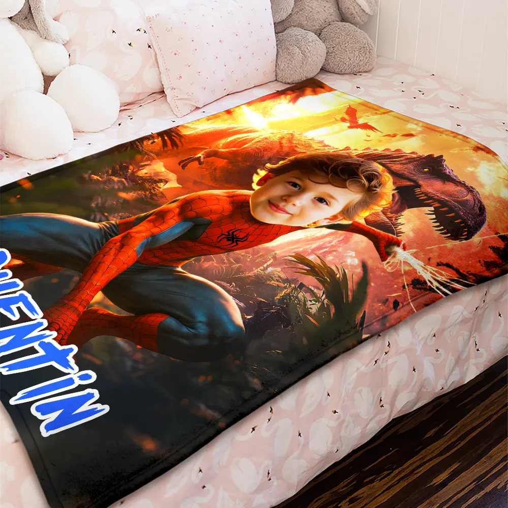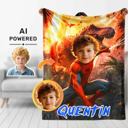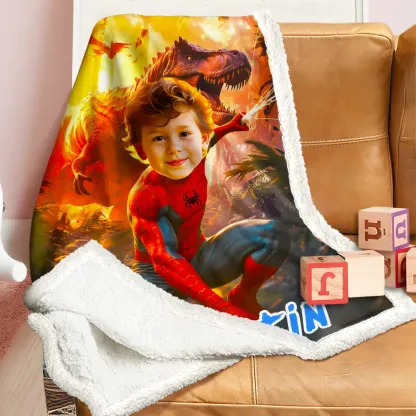 Custom Blanket Ai Powered Spiderboy Fiery Red/Orange Prehistoric Scene Action-Packed Dinosaur Landscape Birthday Gift