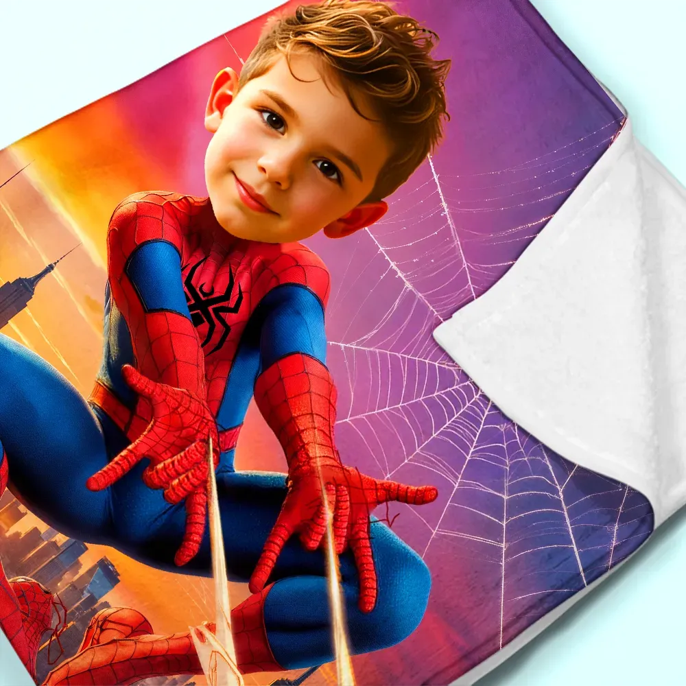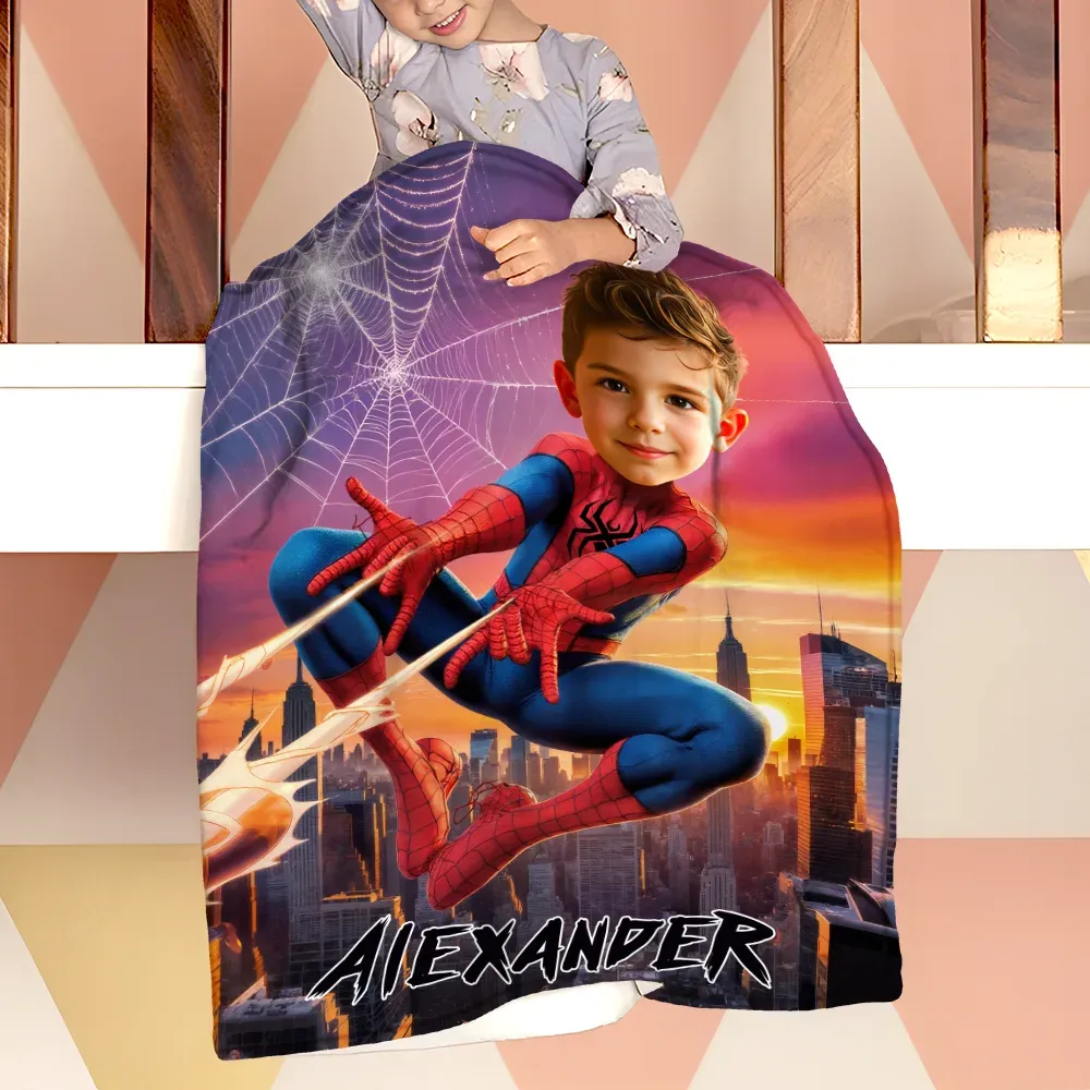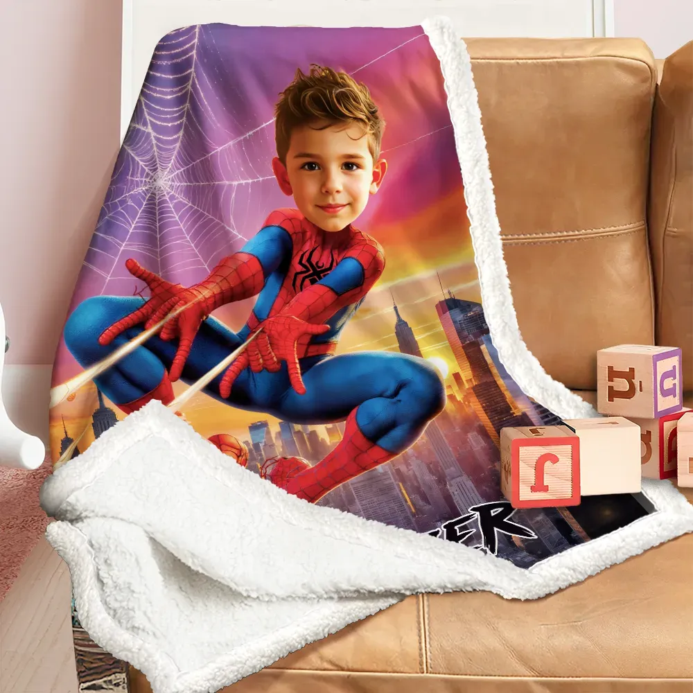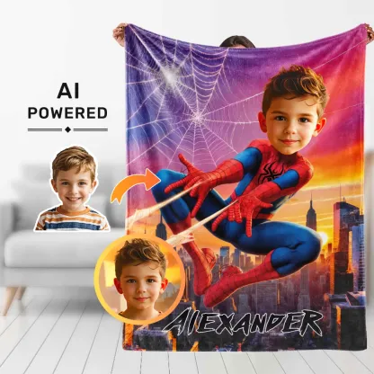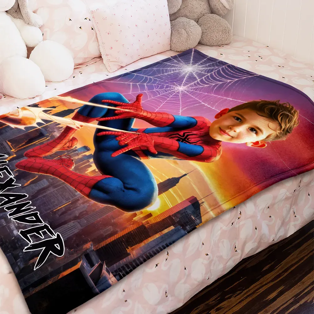 Custom Blanket Ai Powered Spiderboy Purple/Orange Skyline with Web Motifs Neon City Night Scene Birthday Gift