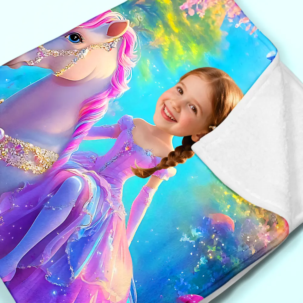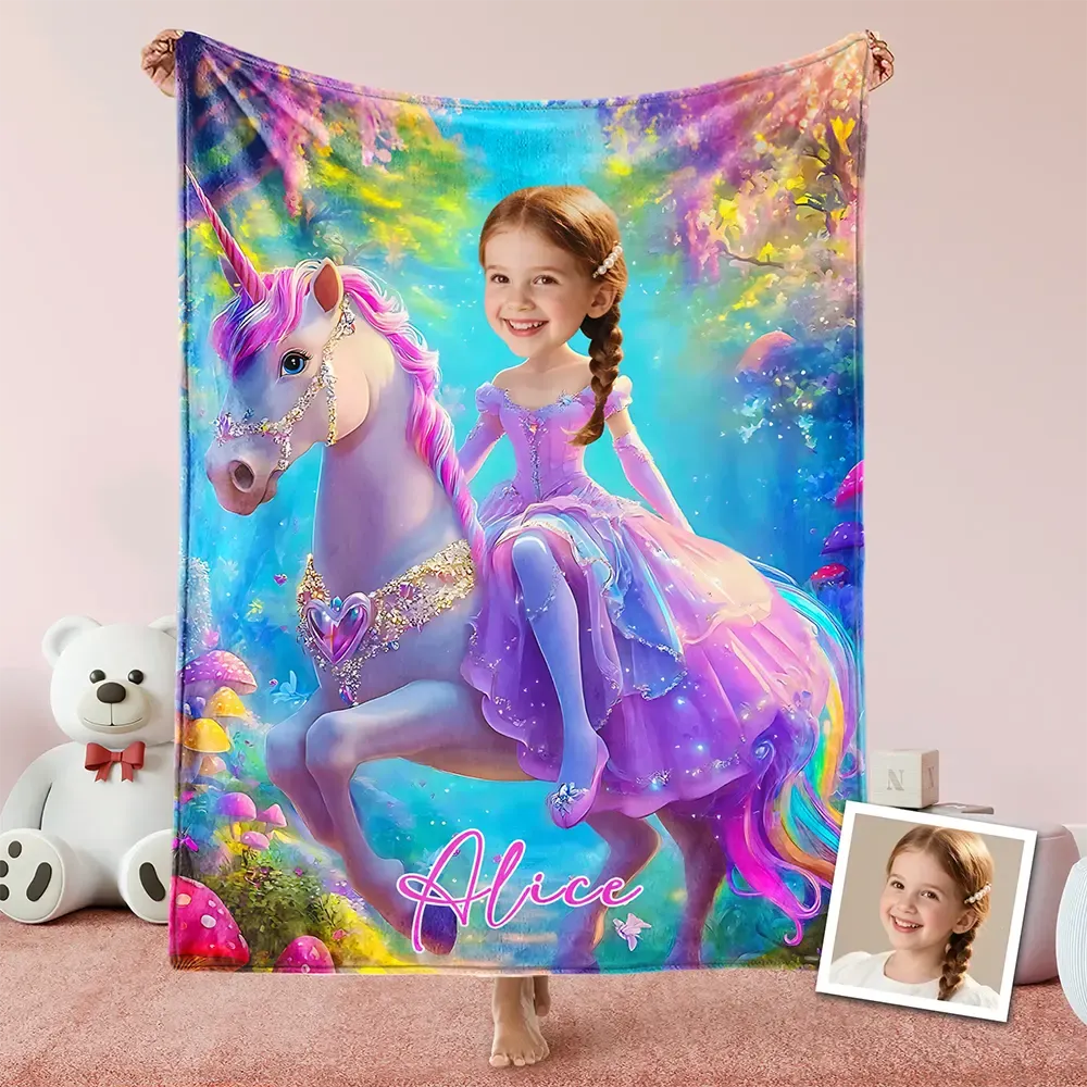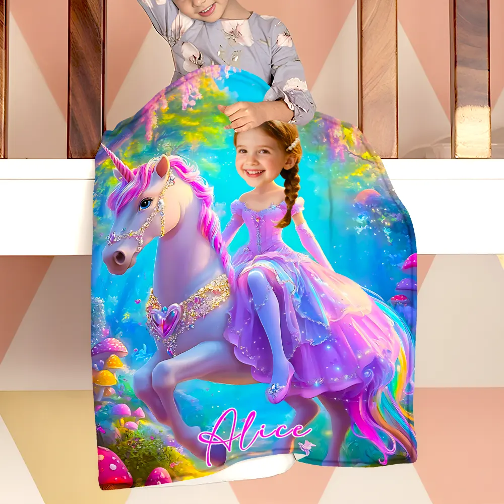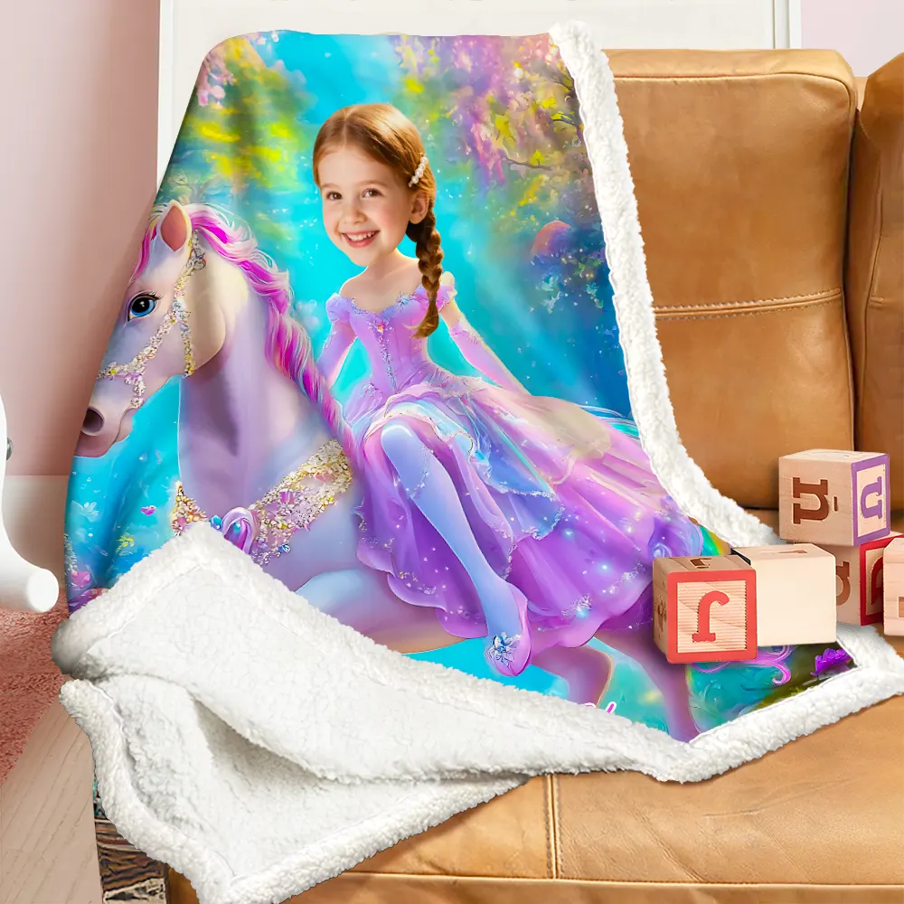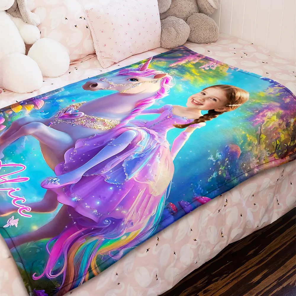 Custom Blanket Gradient Purple Dress Girl on Pink-Maned Unicorn Enchanted Forest Birthday Children's Day Gift