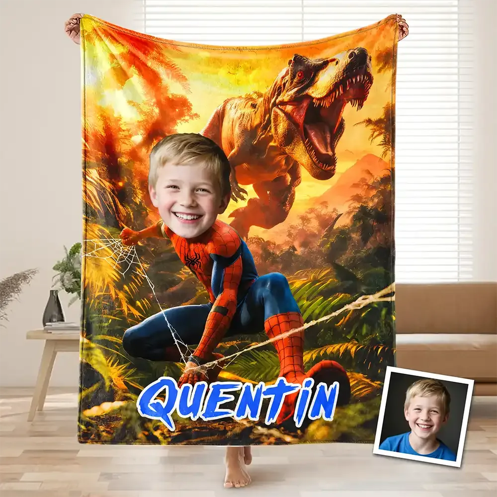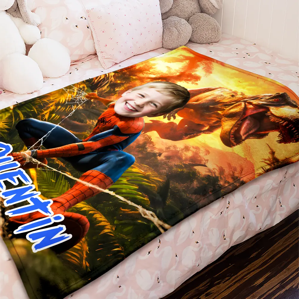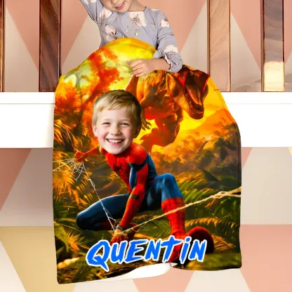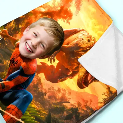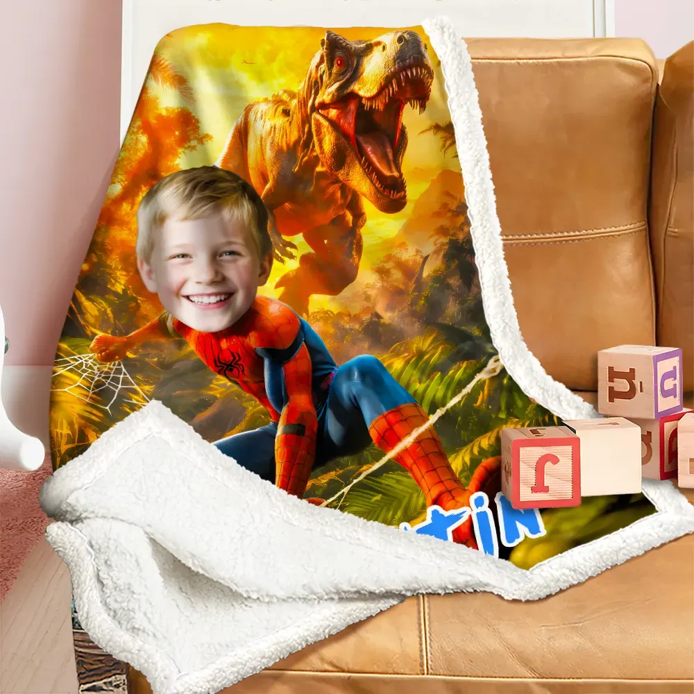 Custom Blanket Superboy Dino Adventure Sunset Orange Background Prehistoric Playtime Children's Day Gift