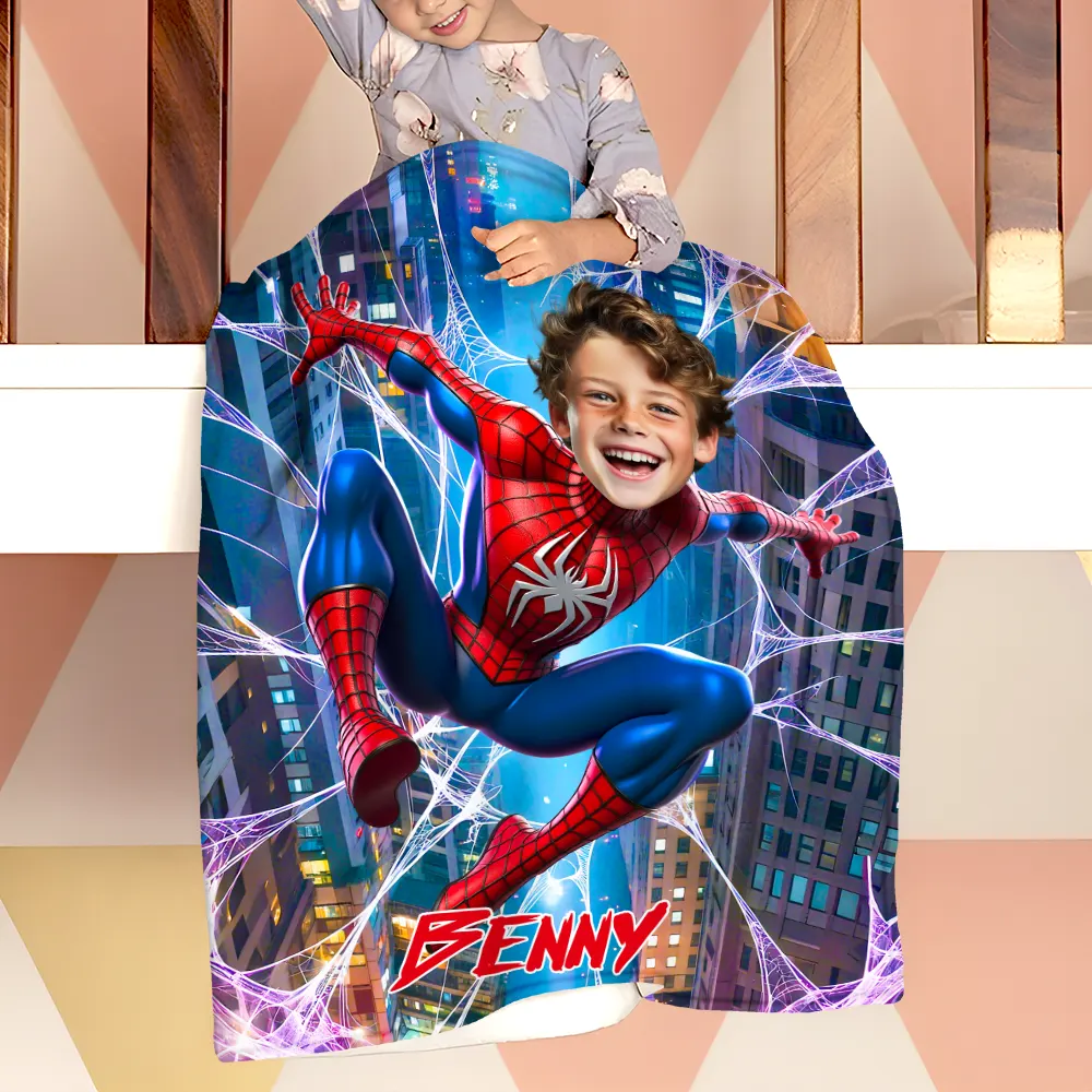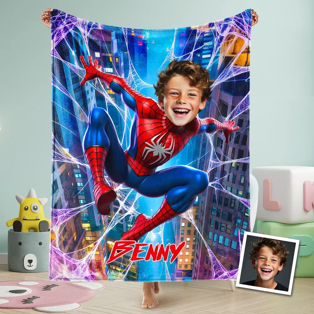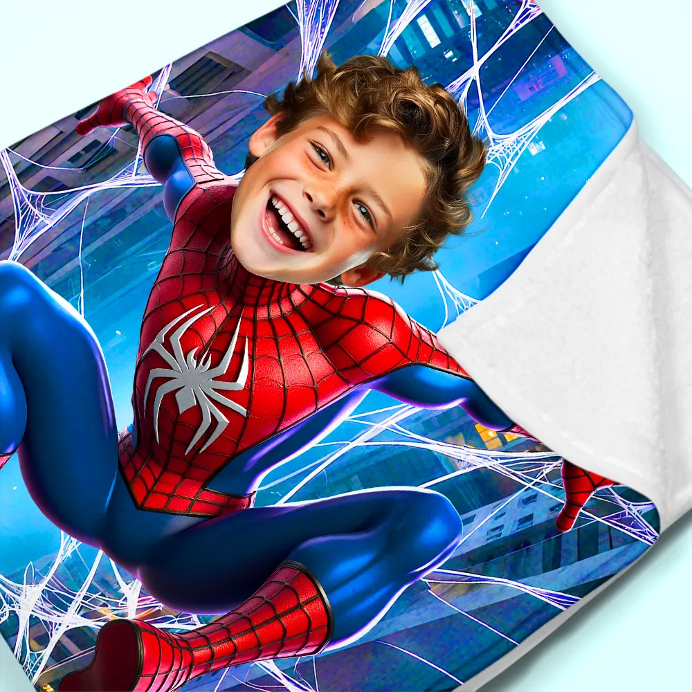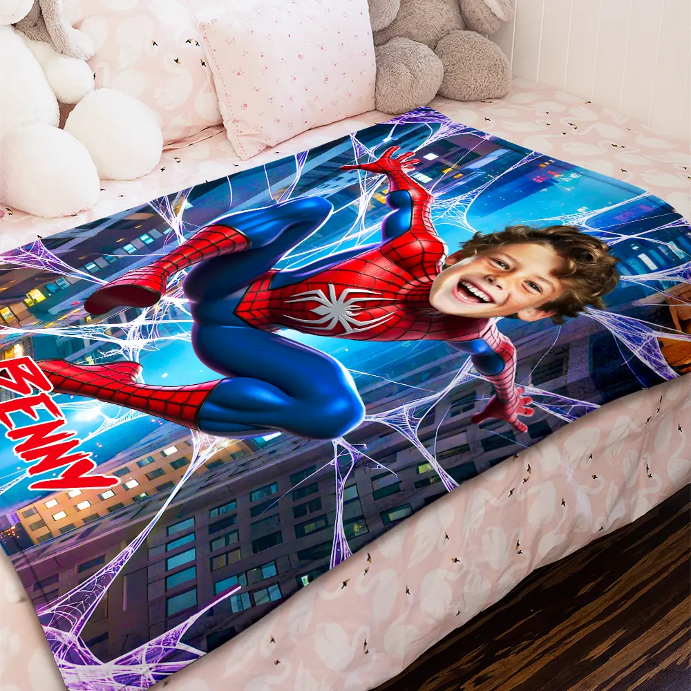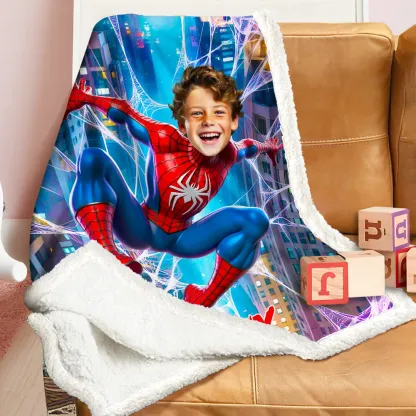Custom Blanket Web Swinger Sky Adventure Purple Web Effects Vibrant City Background Birthday Back to School Children's Day