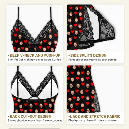 NoneLuxurious Material:Crafted from premium lace and stretch fabric, this sexy nightgown features a smooth, elastic, lightweight, and breathable texture for exceptional comfort. The soft, breathable fabric highlights your alluring charm while delivering an ultra-comfortable wearing experience.Sexy Silhouette:Tailored fit accentuates your captivating curves, with a deep V-neck and push-up bra design for a flawless figure. As a must-have camisole lingerie piece, it effortlessly showcases your stunning appeal.Unique Design:The lace hem with side slits perfectly reveals your sexy leg curves. The hollow-out back design slims your silhouette, accentuates shoulder and neck lines, and highlights your sexy shoulder bladessure to capture your partners attention.Versatile Occasions:This stylish nightgown is ideal as sleepwear, lingerie, loungewear, or for special nights with your loved one.
