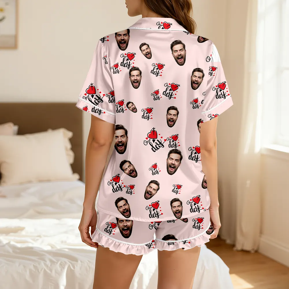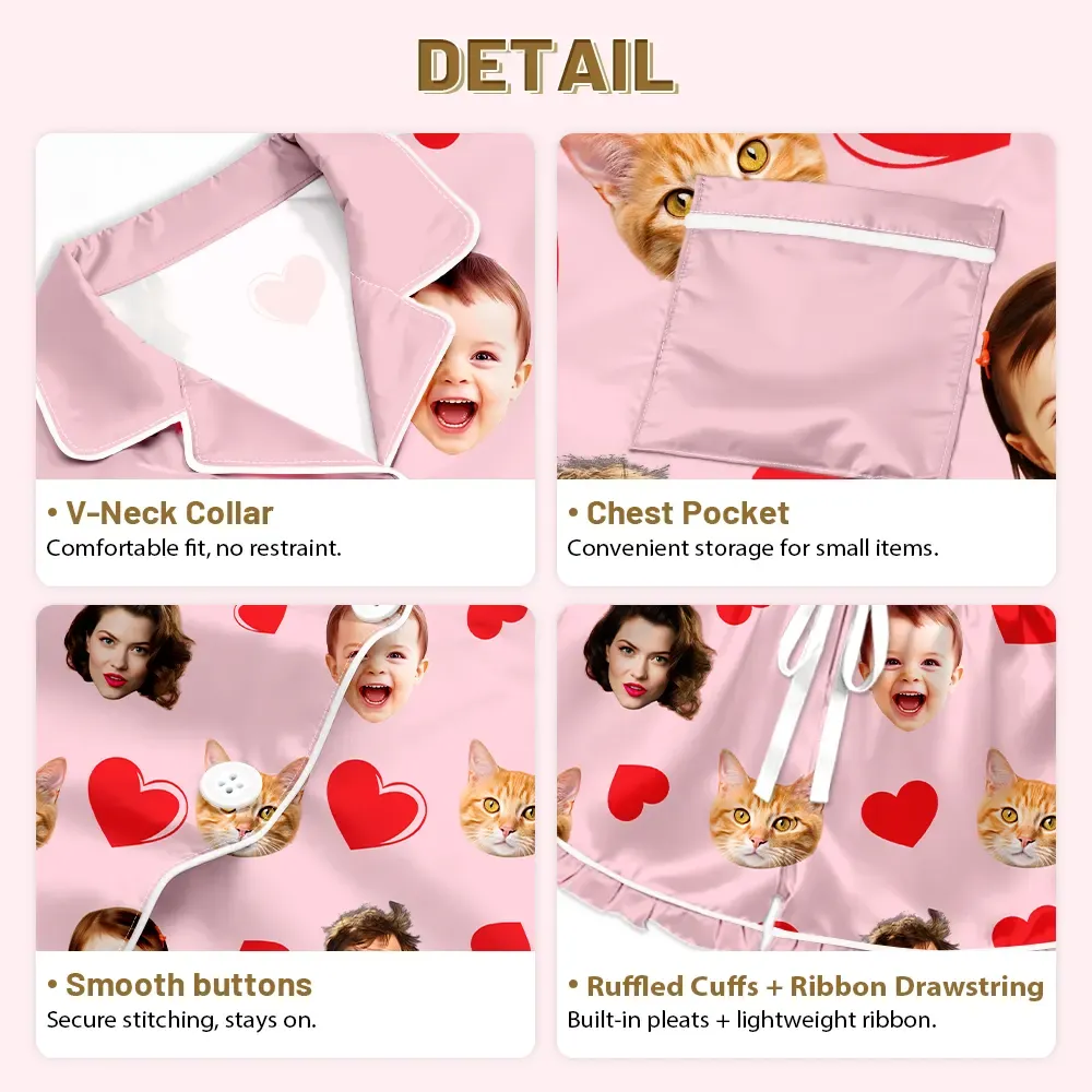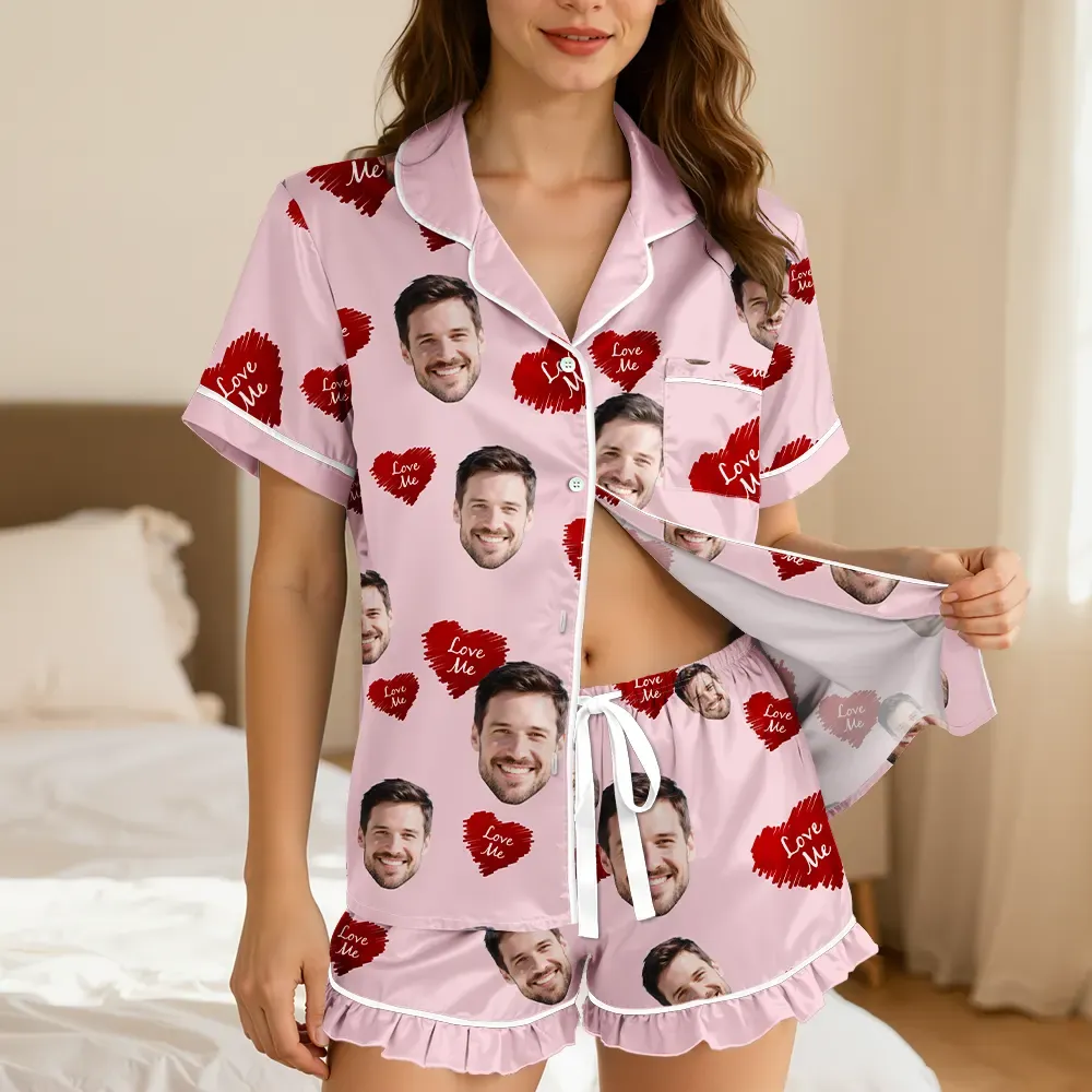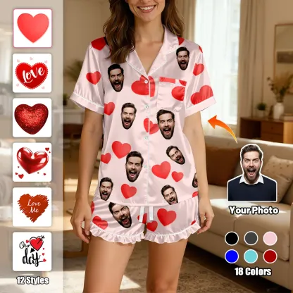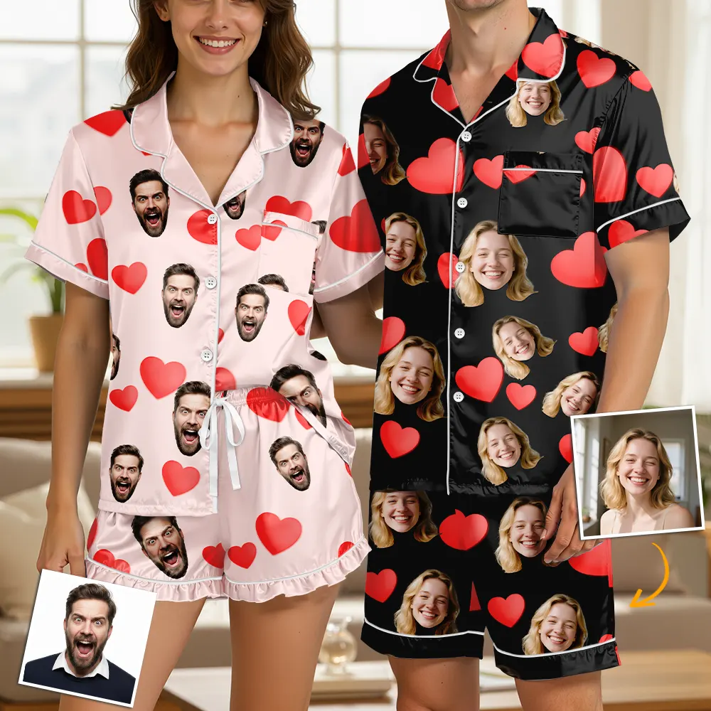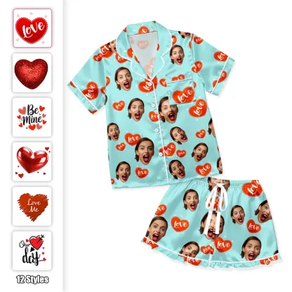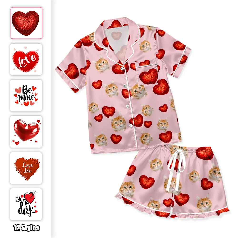 Custom Satin Short Sleeve Pajamas Red Glitter Heart Love Print Expressive Face Pattern Sleepwear Gift For Her