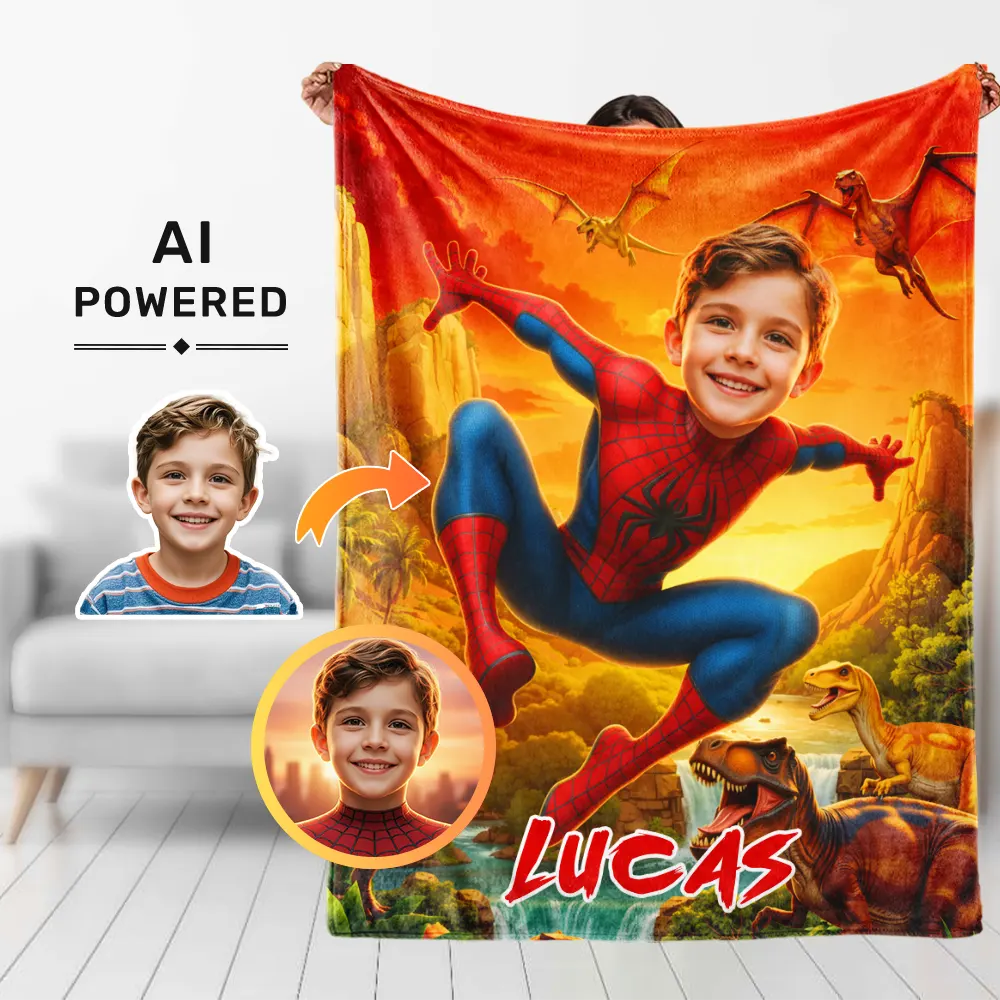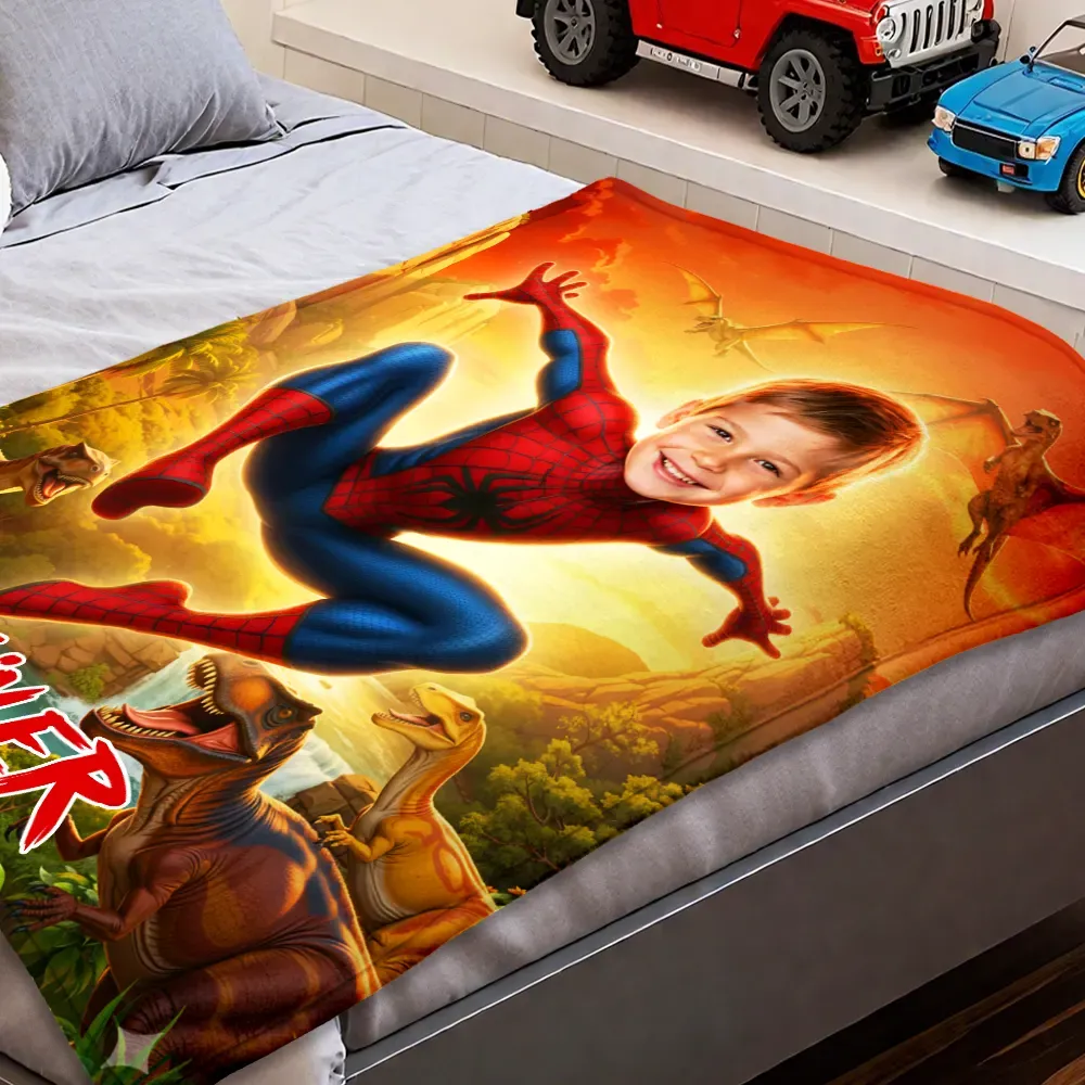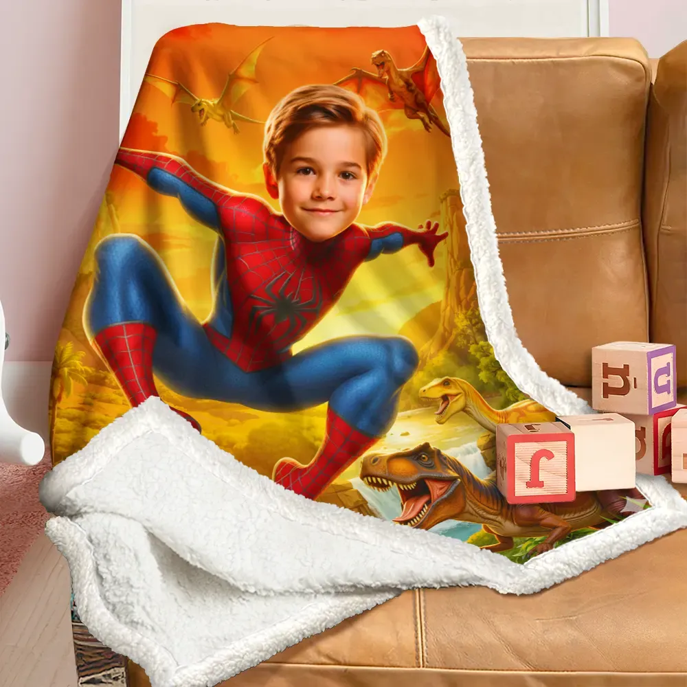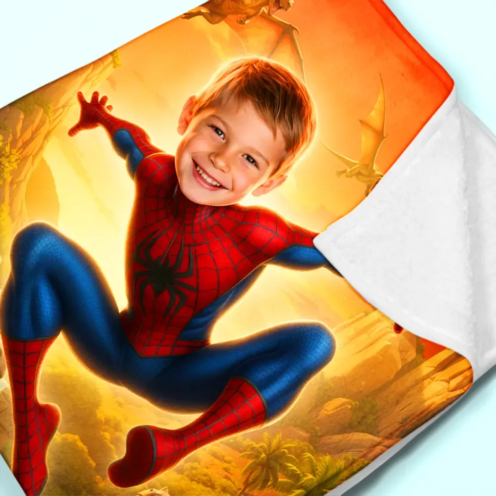 Custom Superhero Blanket AI Powered Jumping Superboy Orange Sky Jurassic Natural Landscape Gift for Boy