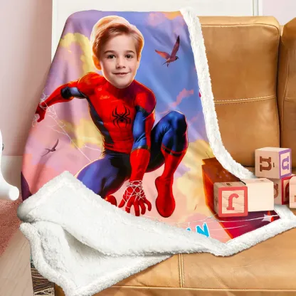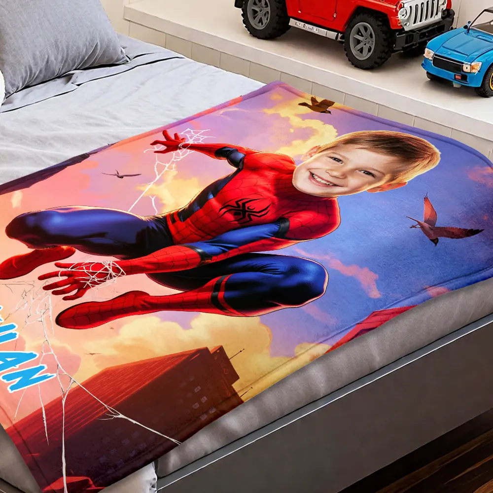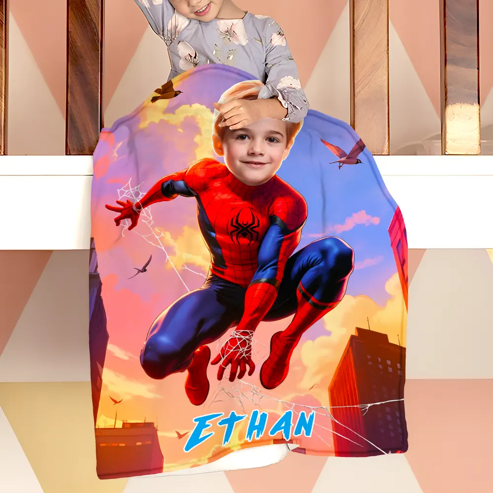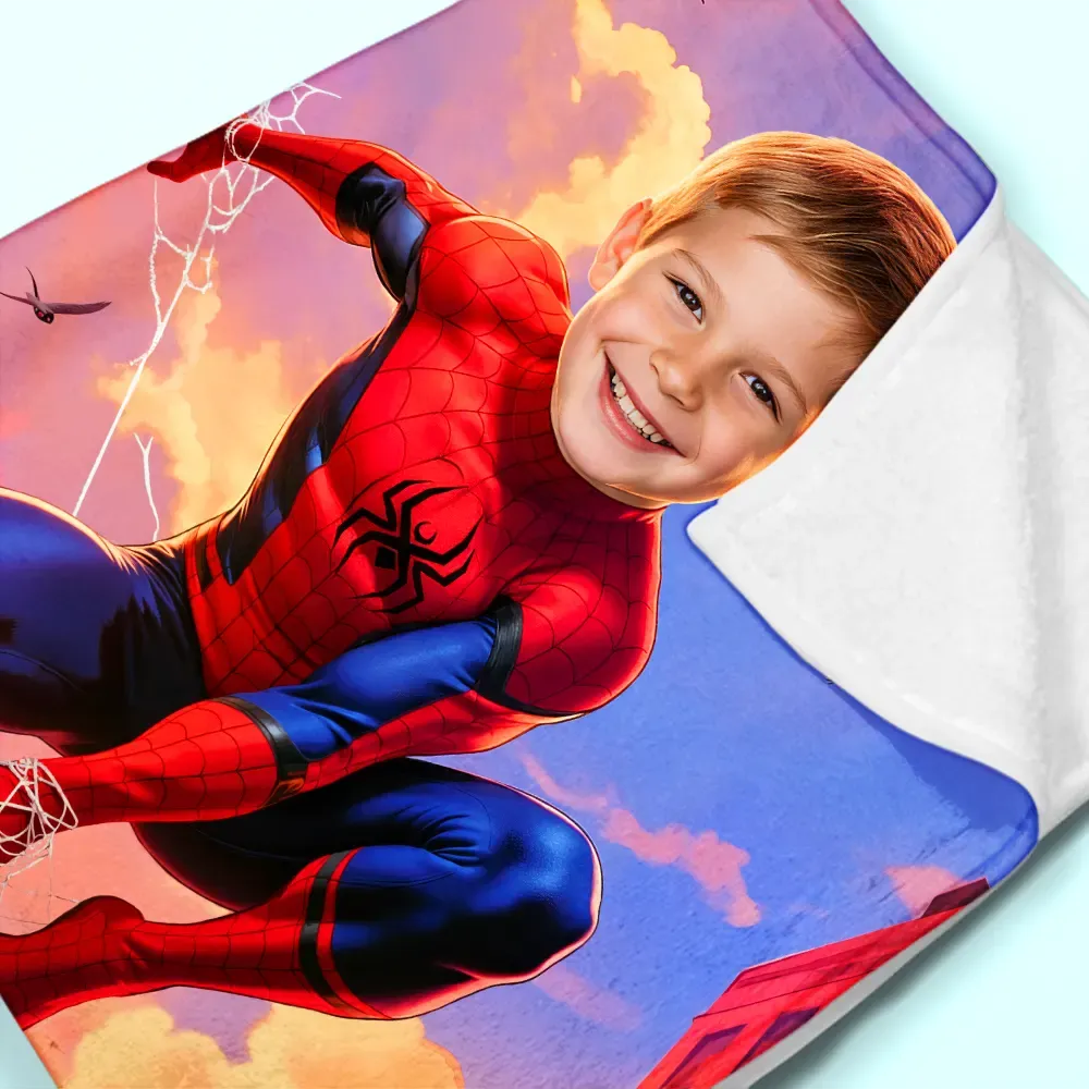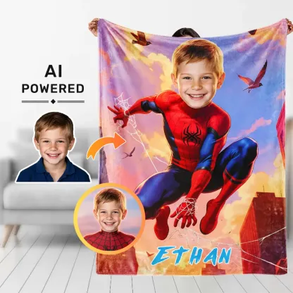 Custom Superhero Blanket AI Powered Jumping Superboy with Blue Sky & Red Buildings Gift for Boy
