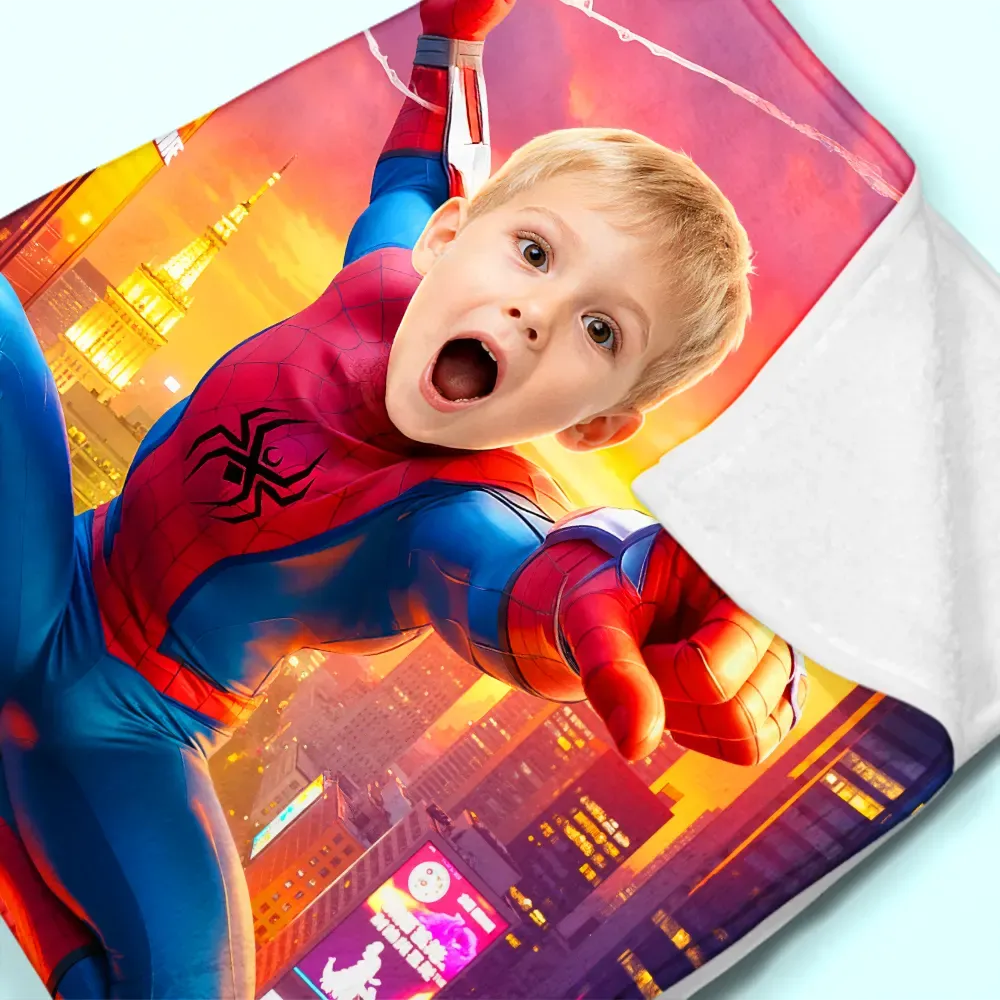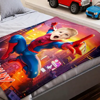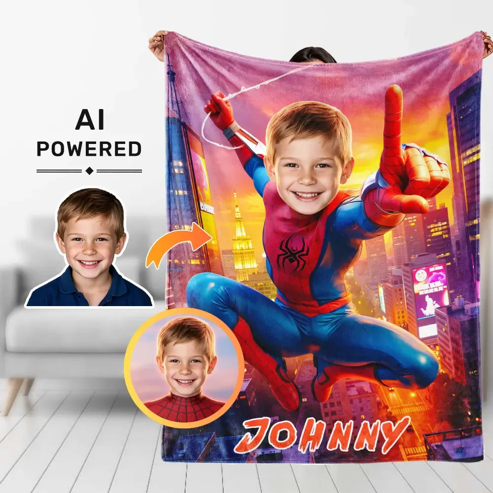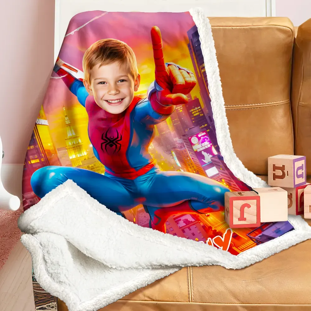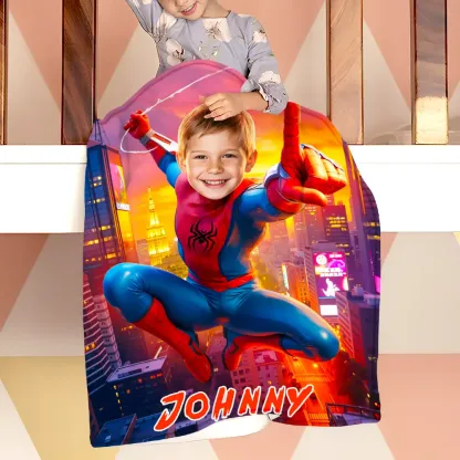 Custom Superhero Blanket AI Powered Superboy City Dusk Purple-Orange Sky Gift for Boy