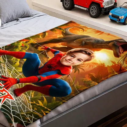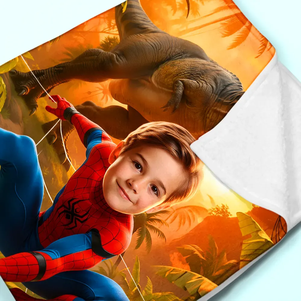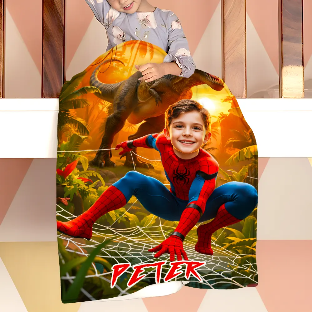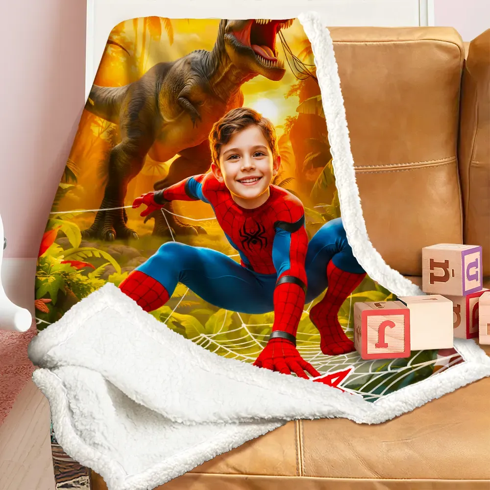 Custom Superhero Blanket AI Powered Superboy & Dinosaur Adventure Warm-Toned Jungle Gift for Boy