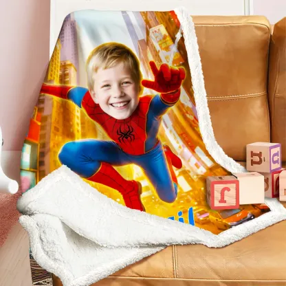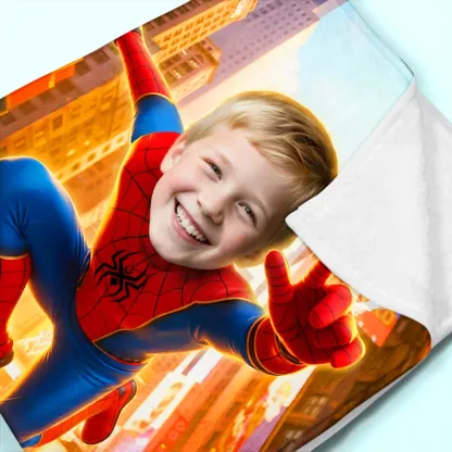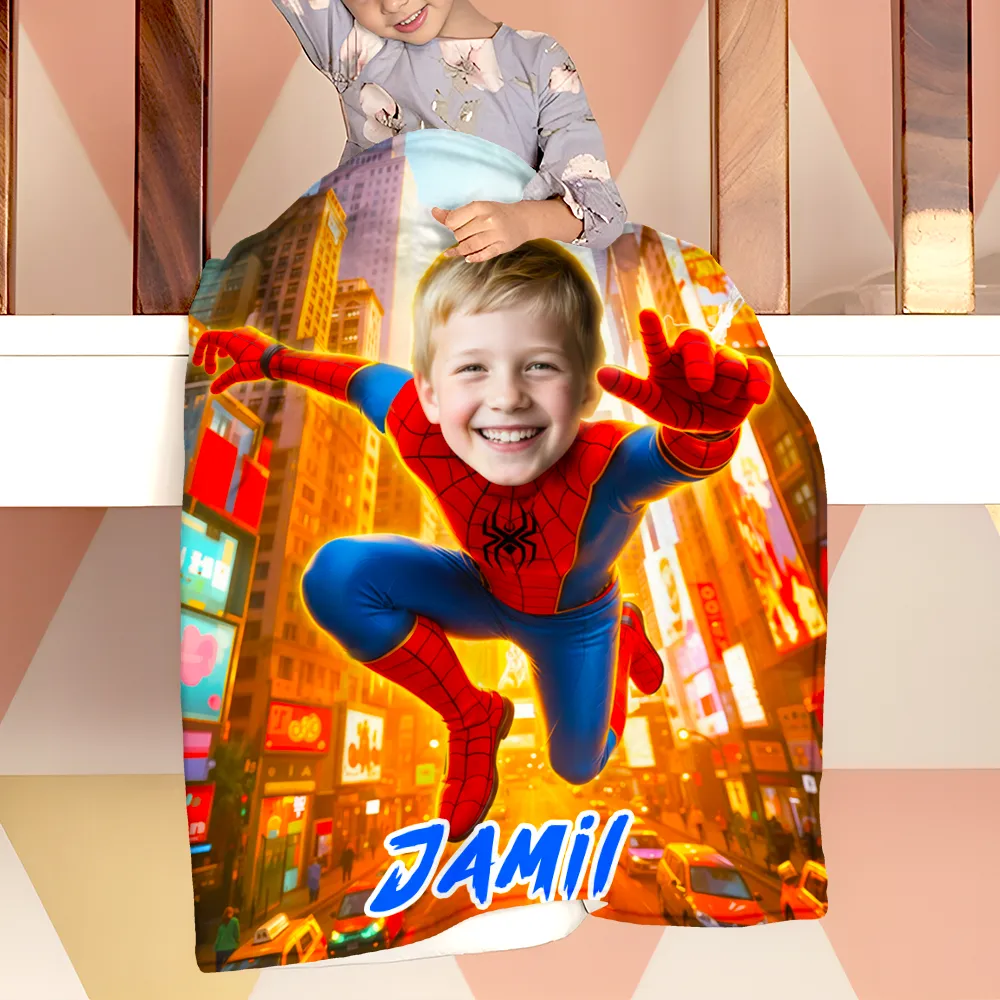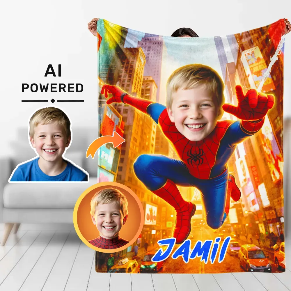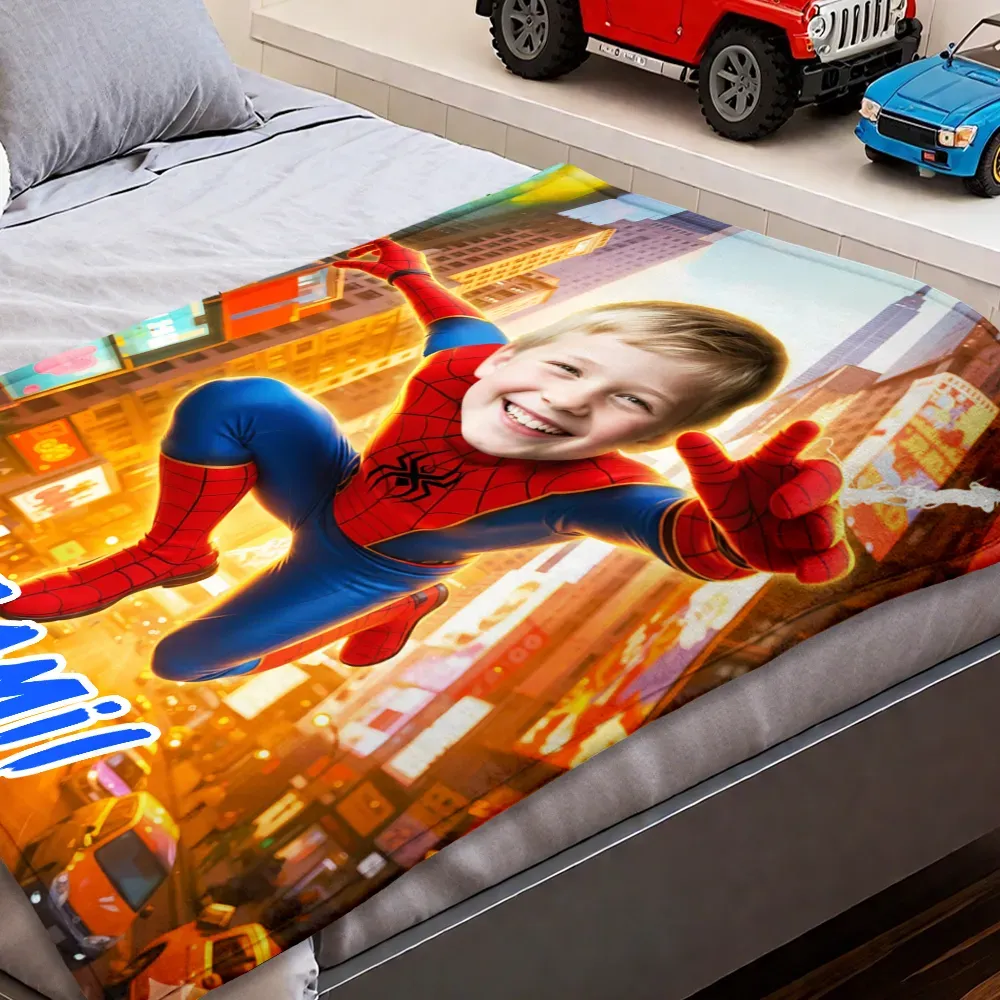 Custom Superhero Blanket AI Powered Superboy Travel Through the City Gift for Boy