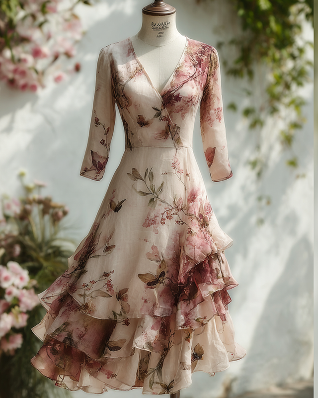 Women's elegant floral embroidered gradient irregular ruffled linen patchwork dress 1967