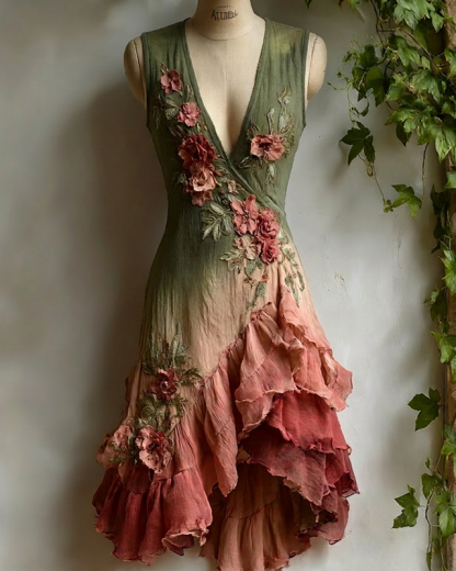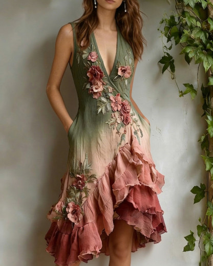 Women's elegant floral embroidered gradient irregular ruffled linen patchwork sleeveless dress 6232