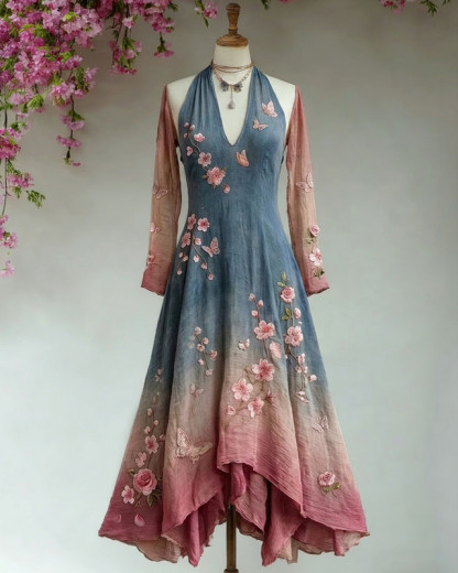 Women's Elegant Flowers Embroidery Irregular Ruffle Linen Patchwork Dress 6326
