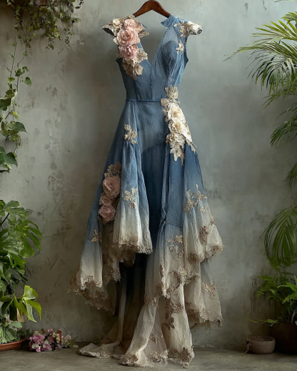 Women's Elegant Gradient Flowers Embroidery Irregular Mesh Dress 8716