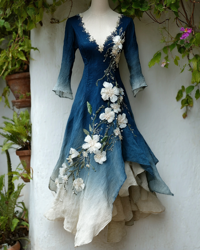 Women's Elegant Gradient Flowers Irregular Ruffle Linen Dress 8009