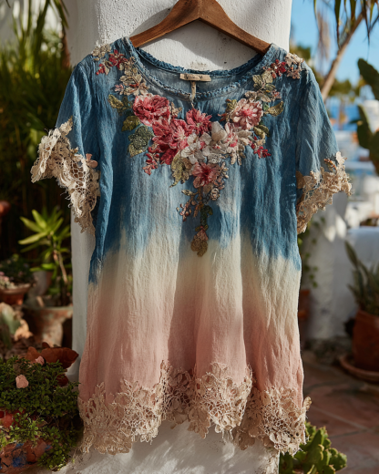 Women's Tie-dye Gradient Lace Patchwork Flowers Embroidery Blouse 6291