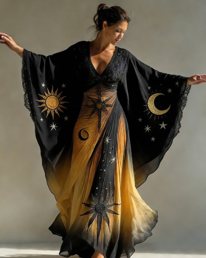 Women's Spring Fashionable Comfortable Star and Moon Embroidery Black Gold Tie-Dye Kaftan 2815