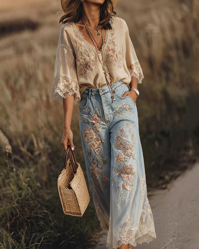 Women's Resort Style Floral Embroidered Linen Top & Pants Two-Piece Set 3587