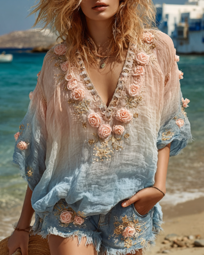 Women's Outdoor Elegant Floral Embroidered Linen Blend Top & Shorts Two-Piece Set 7235