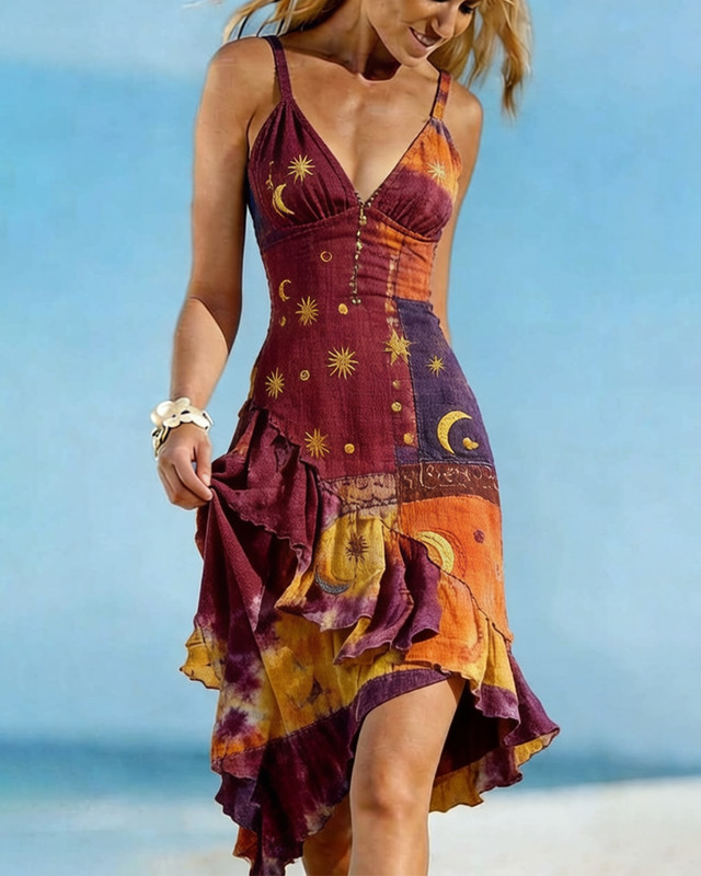 Women's Summer Star and Moon Embroidered Irregular Ruffled Linen Patchwork Dress 4775