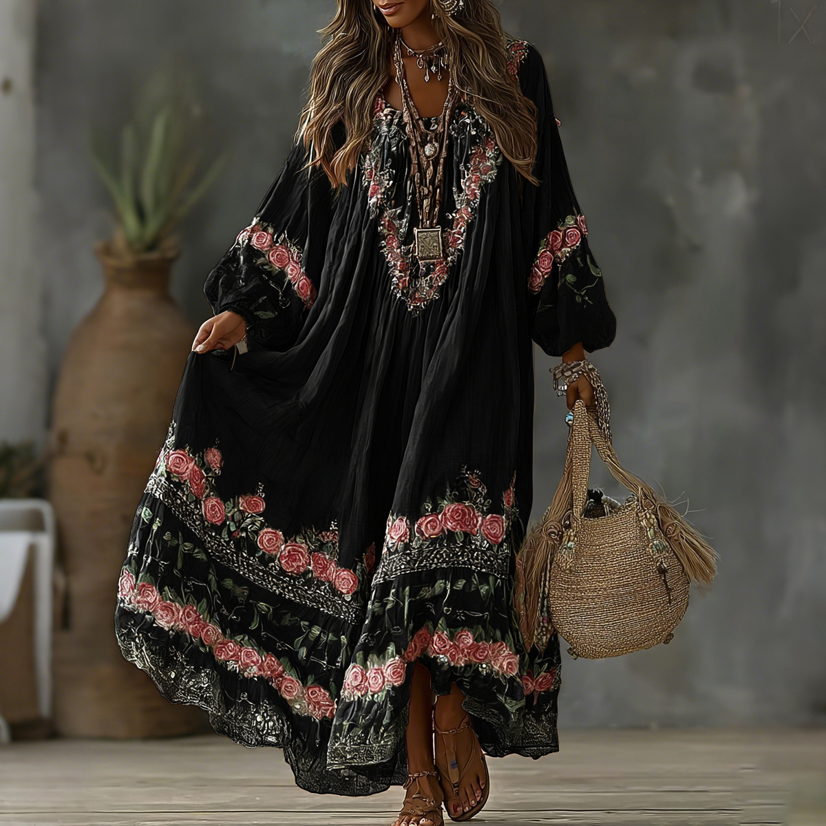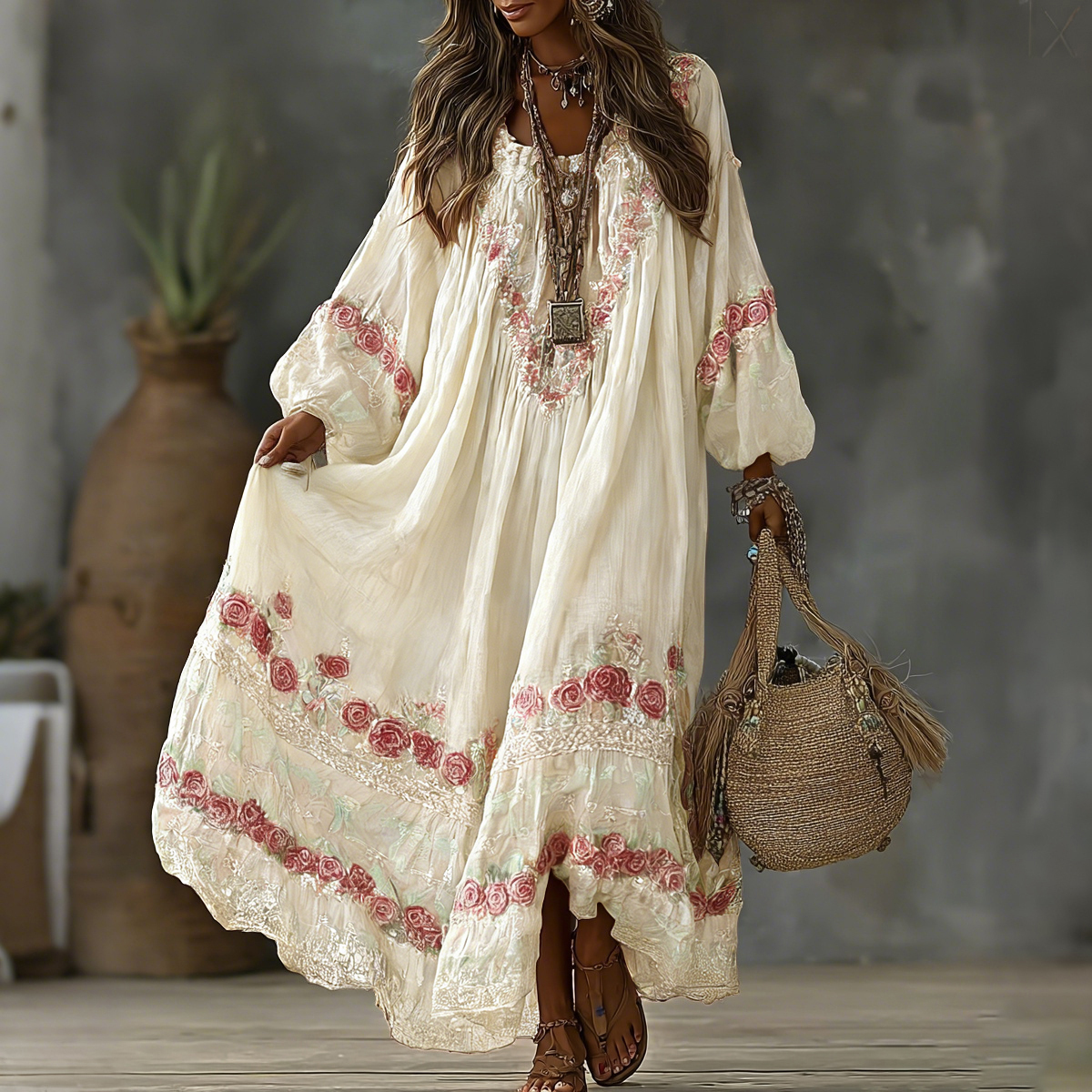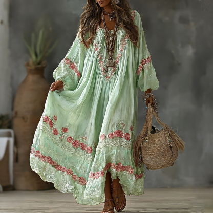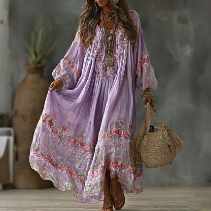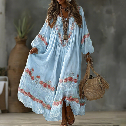 Women's Vintage Floral Art Print Flowy Linen Blend Casual Long Sleeve Maxi Dress d486