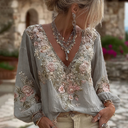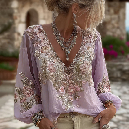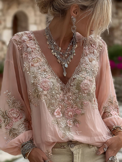 Women's Vintage Pink Floral Embroidered Art Pattern V-neck Long Sleeve Blouse 9989