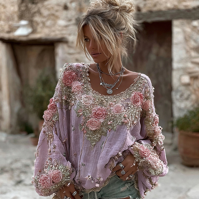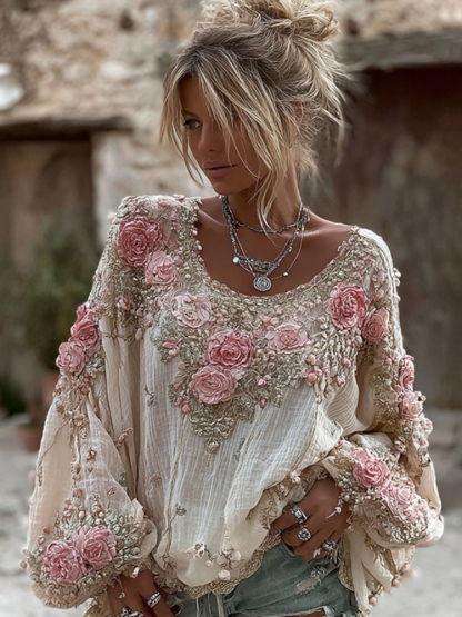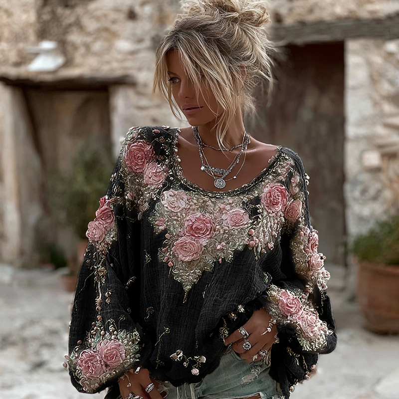 Women's Vintage Pink Rose Embroidery Art Round Neck Long Sleeve Linen Blend T-shirt 6094