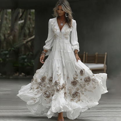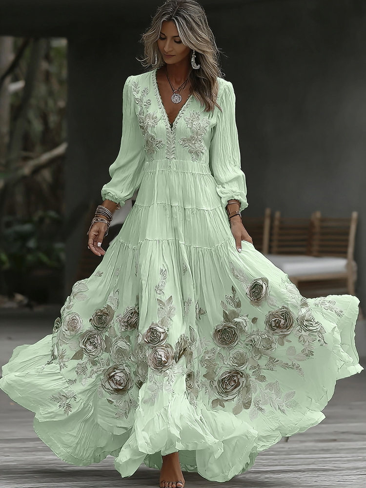 Women's Vintage Rose Embroidery Art V-neck Casual Long Sleeve Maxi Dress b390
