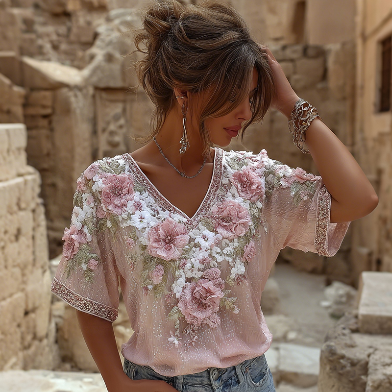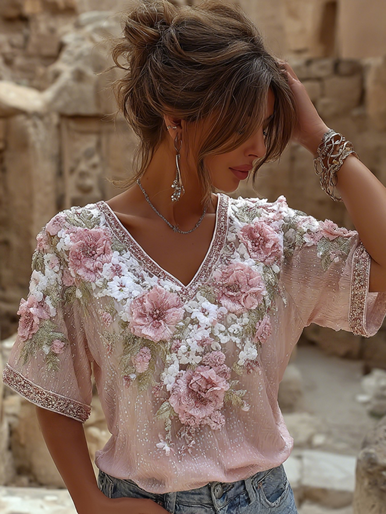 Women's Vintage Roses Embroidered Art V-neck Short Sleeved T-shirt a5ec