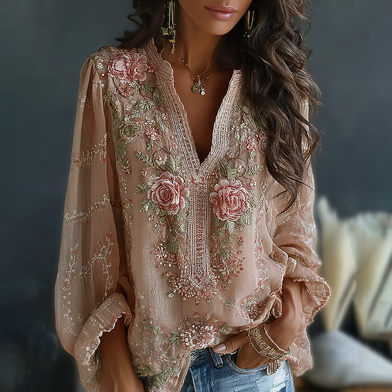 Women's Vintage Spring Floral Embroidered Art Print Flowy Linen Blend Casual Tops 8c91