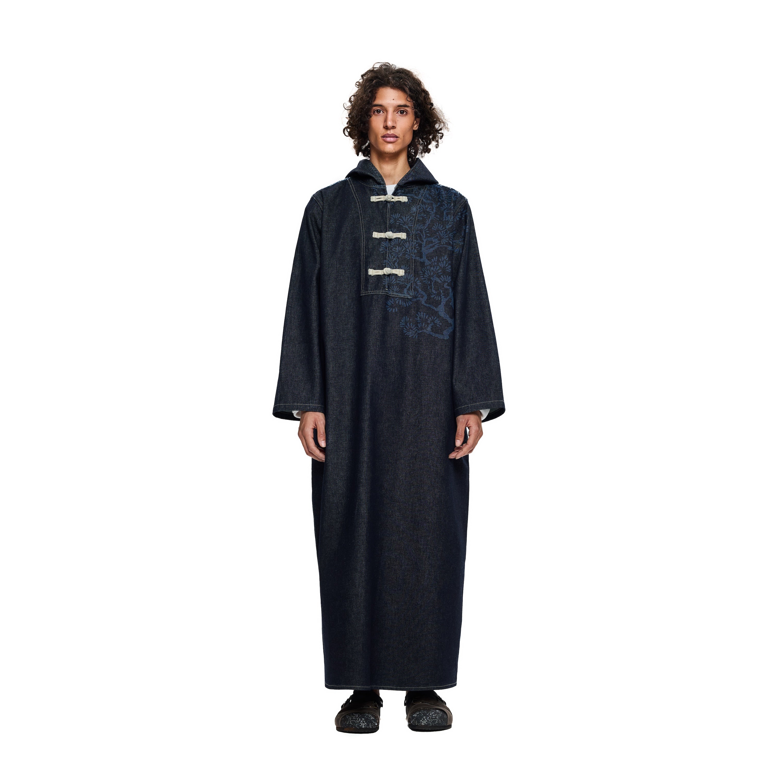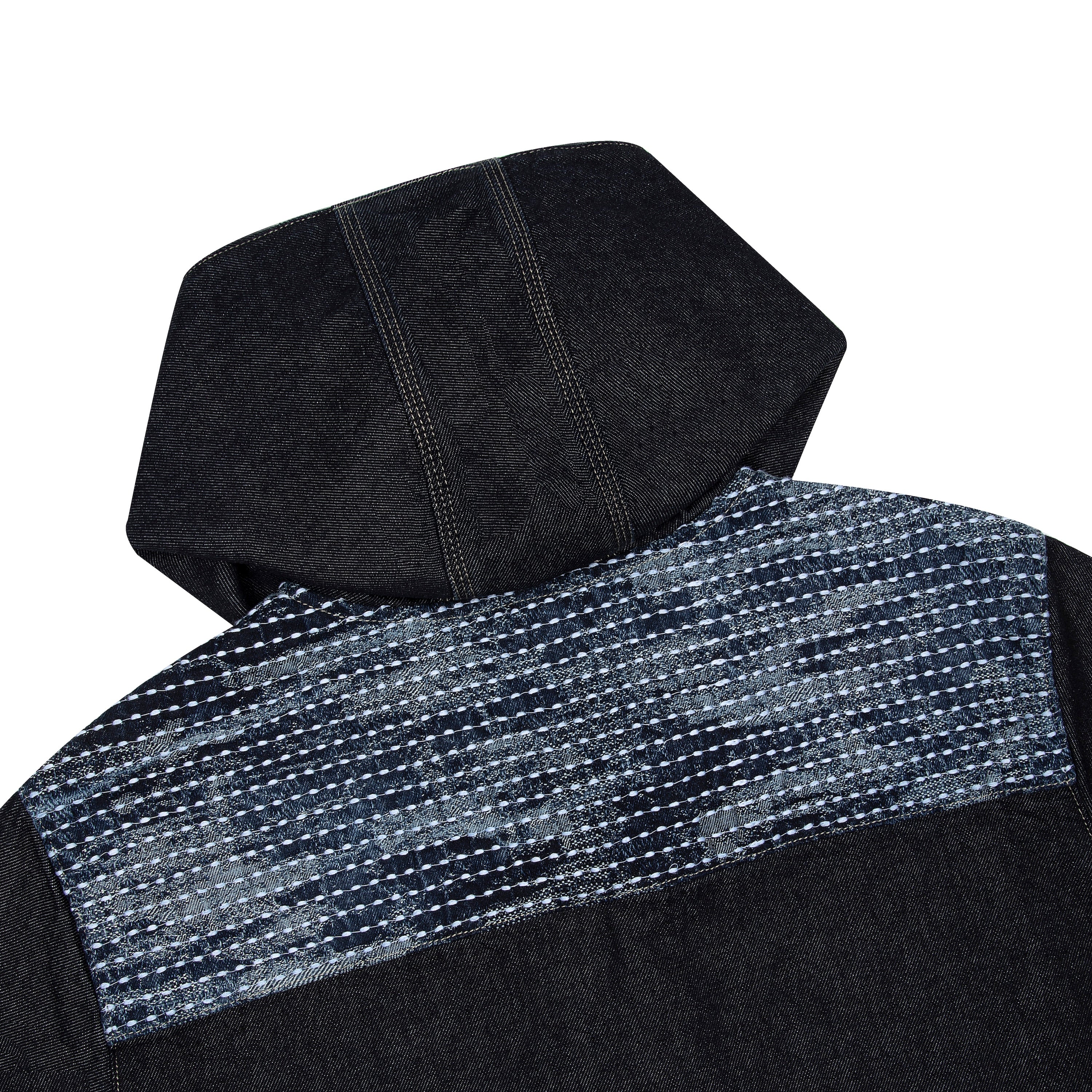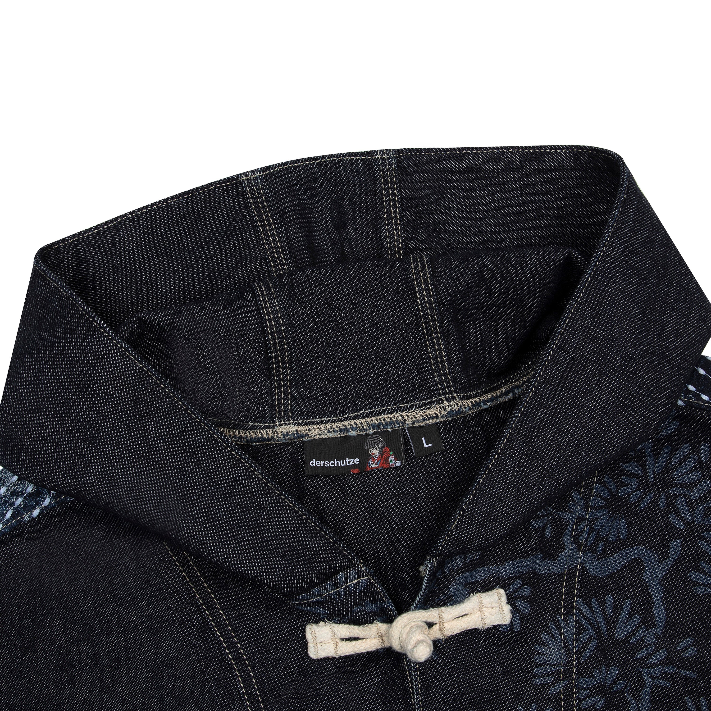 11oz raw denim / 100% cotton / laser print on front / boro style patchwork on back robe / closure cord / wash inside out / fits true to size / all profits will be donated